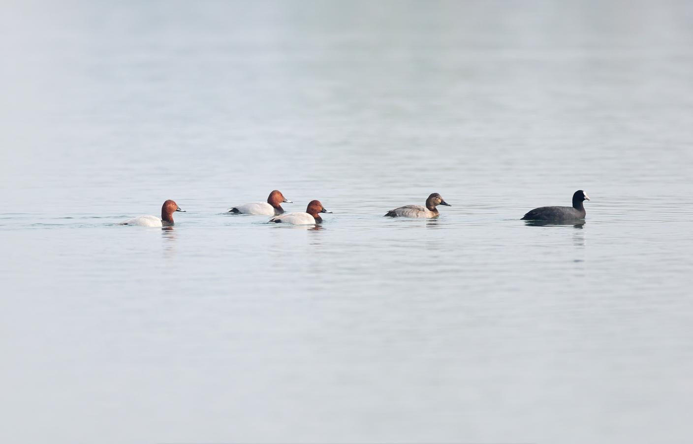 在东安湖嬉戏的凤头潜鸭和骨顶鸡