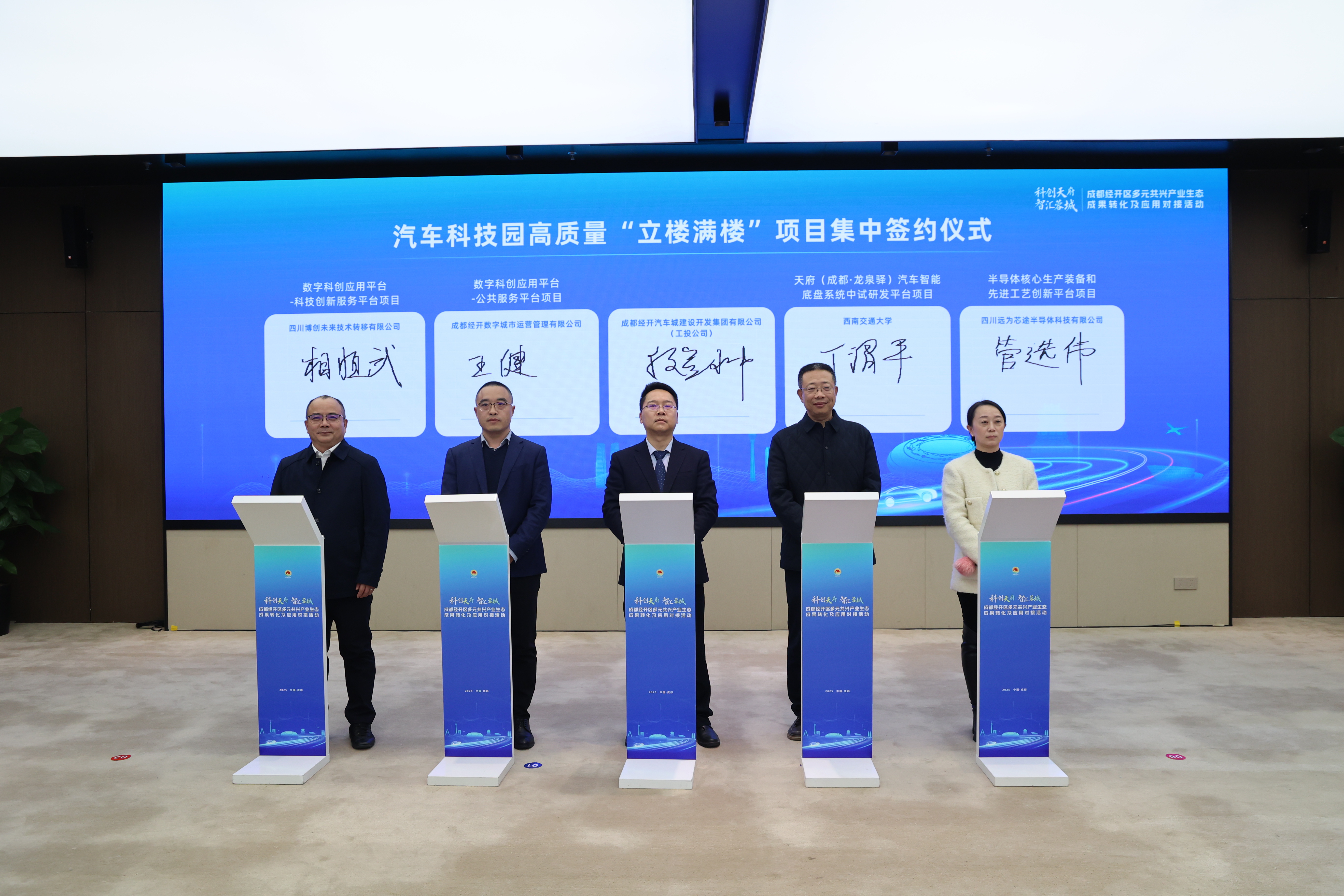 在项目签约环节,成都经开汽车城建设开发集团有限公司与相关创新平台负责人集中签约4个省级高质量发展激励项目,涵盖数字科创应用平台、汽车智能底盘系统中试研发平台、半导体核心生产装备创新平台等。