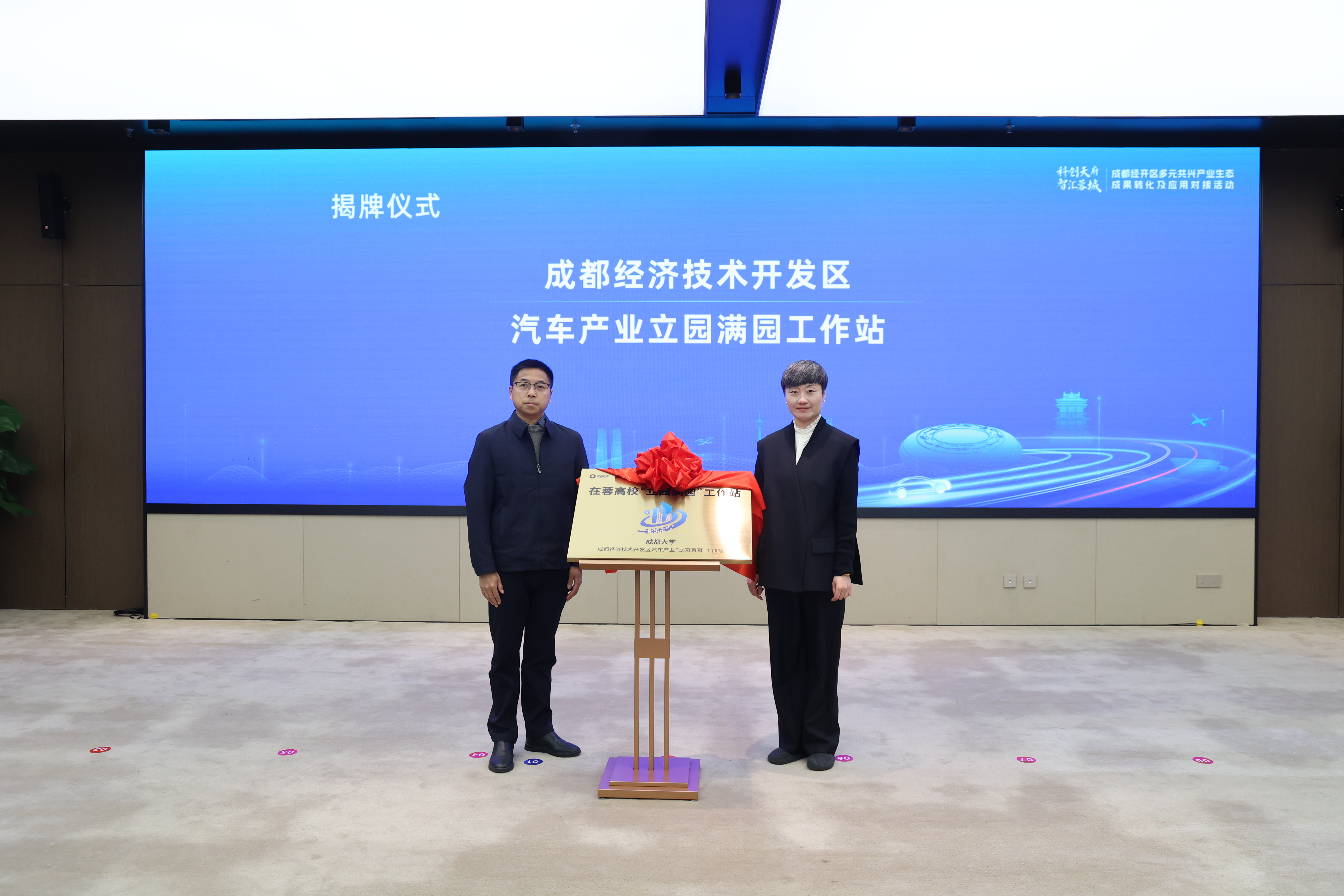 活动现场,成都经济技术开发区汽车产业“立园满园”工作站正式揭牌成立。该工作站由成都大学牵头建设,是成都市首批8个在蓉高校“立园满园”工作站试点项目之一,将着力聚焦汽车产业“新四化”趋势,构建“党建共建、人才共育、孵化转化、就业创业”四位一体协同机制,打造高校智力资源与园区产业需求精准对接的归口服务平台。