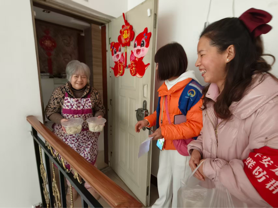 饺子出锅后,志愿者们将热气腾腾的饺子分装打包,分成多路上门送到80余户空巢老人家中。“李奶奶,我们给您送饺子来啦!”敲开独居老人李奶奶的家门,志愿者的声音让老人立刻起身迎接。接过还冒着热气的饺子,李奶奶连连道谢:“社区真是太贴心了,时时刻刻想着我们这些老人。”