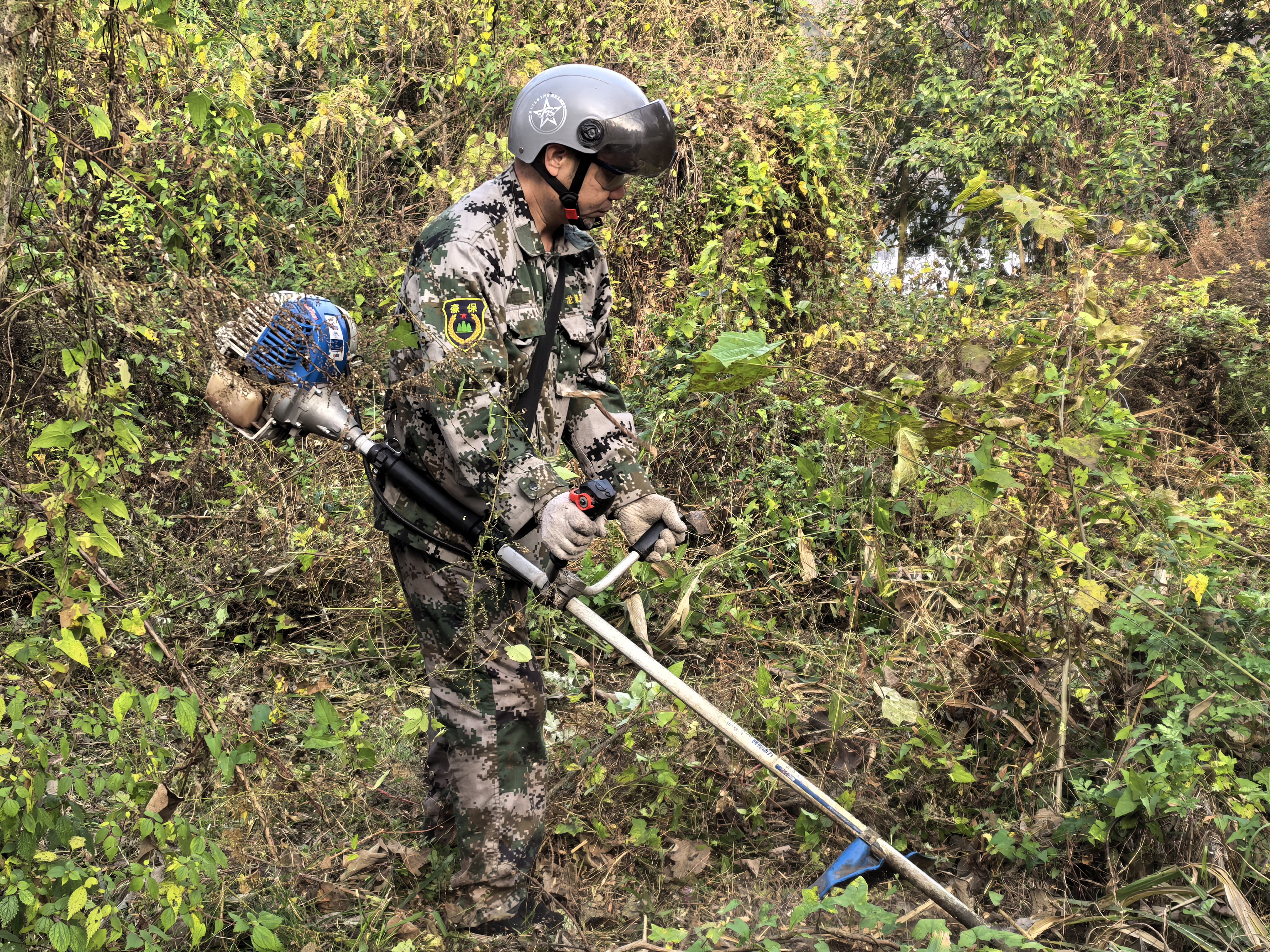 当天的巡山完毕,罗廷宏又和队员们开着车向山下的百工堰驶去,车辆驶过,关于秸秆禁烧的广播也一路响过。来到百工堰东侧的低洼处,几名工人正用割灌机、镰刀等工具清理灌木,10米宽的防火隔离带已初见雏形,一旦发生山火,隔离带能阻断火势,确保能尽快扑救,减少损失。砍伐下来的芭茅、树枝、杂草还不能一堆了事,工人还将其全部收拢,堆放在统一区域,确保安全。“这一片往来徒步、钓鱼的市民有很多,万一携带火种并在森林使用了,后果不堪设想,砍出隔离带有利于保护好林子。”罗廷宏表示。