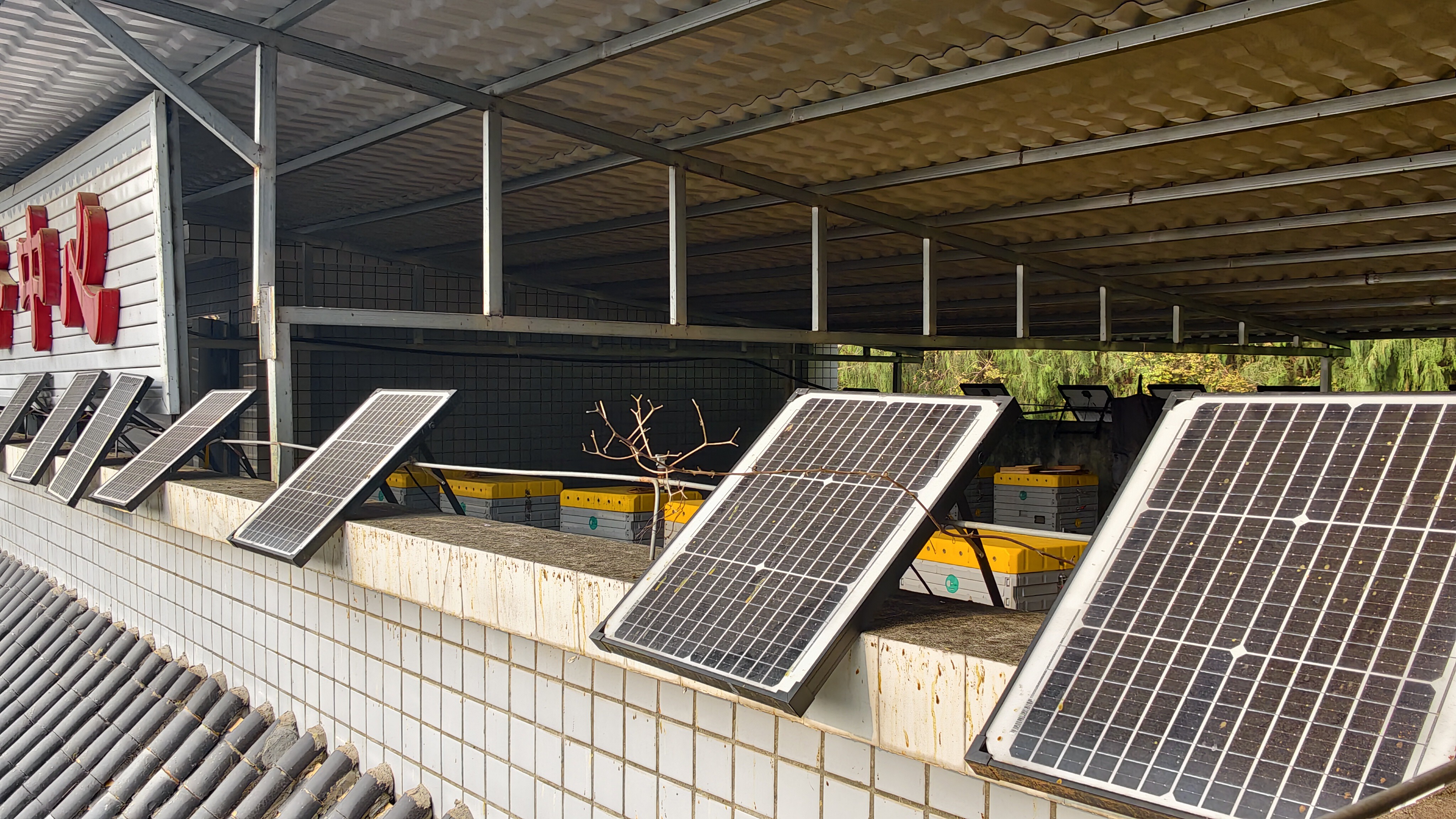 在山泉镇长丰村党群服务中心的养蜂基地,一排排智能蜂箱整齐排列。灰色的箱体,盖子和底部都是亮眼的黄,每个蜂箱都连接着一块太阳能板,在阳光下泛着微光,科技感十足。