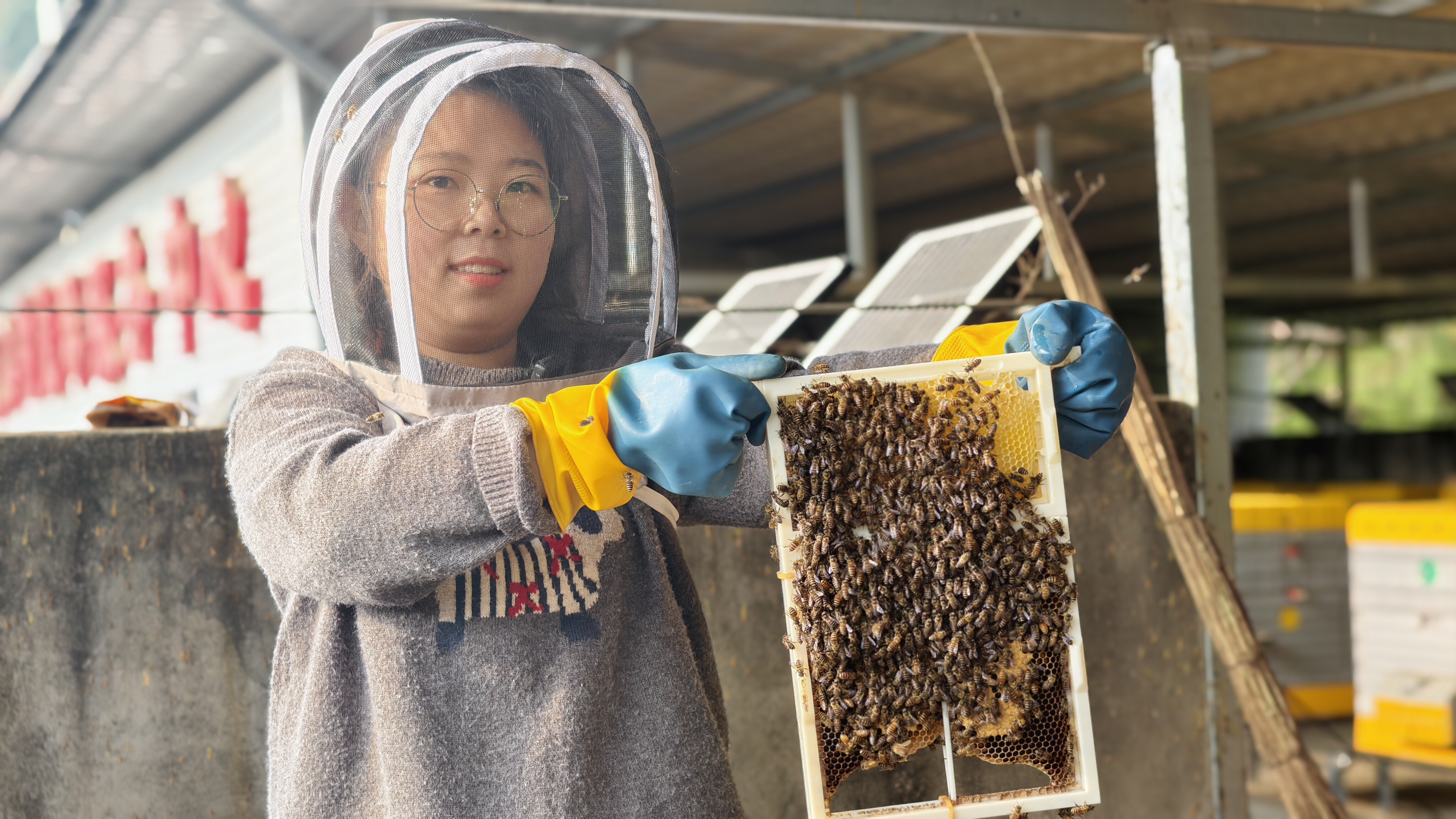“现在正是枇杷花期最旺盛的时候,蜜蜂基本上都出去采蜜了。”曾璐说,得益于这段时间充足的蜜源,村里每半个月就能摇一次蜂蜜,每次产量可达五六十斤。她随意打开一个智能蜂箱,指着箱内白色的蜜脾介绍:“你看这个位置,蜜已经满了,这种情况就可以直接摇蜂蜜了。”