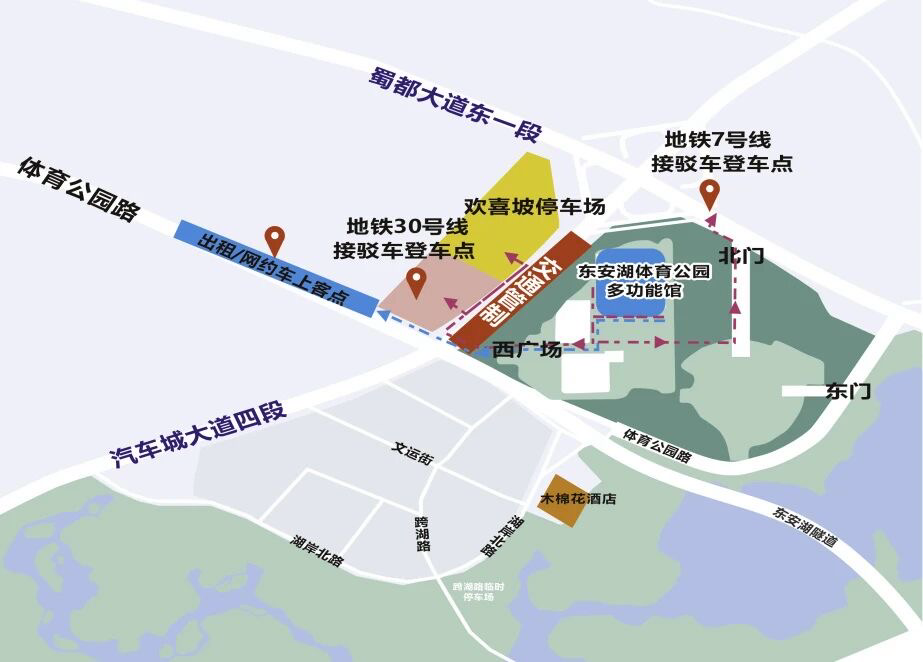 乘坐地铁30号线到达龙泉驿火车站南站,可直接选乘大巴车(坐满即走,车程约15分钟)到达欢喜坡停车场,下车后步行到达东安湖体育公园。