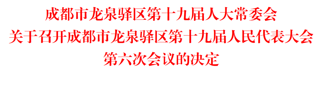 根据《中华人民共和国地方各级人民代表大会和地方各级人民政府组织法》第五十条第三款规定,经成都市龙泉驿区第十九届人大常委会第三十二次会议决定:成都市龙泉驿区第十九届人民代表大会第六次会议于2026年1月中旬在龙泉驿召开,正式会期预计两天半(不含预备会议)。根据上级工作安排,若需调整大会召开时间或有关事项,授权区人大常委会主任会议确定。