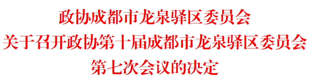 中国人民政治协商会议第十届成都市龙泉驿区委员会常务委员会第二十二次会议决定:中国人民政治协商会议第十届成都市龙泉驿区委员会第七次会议于2026年1月12日至14日在中共成都市龙泉驿区委党校召开,会期两天半。