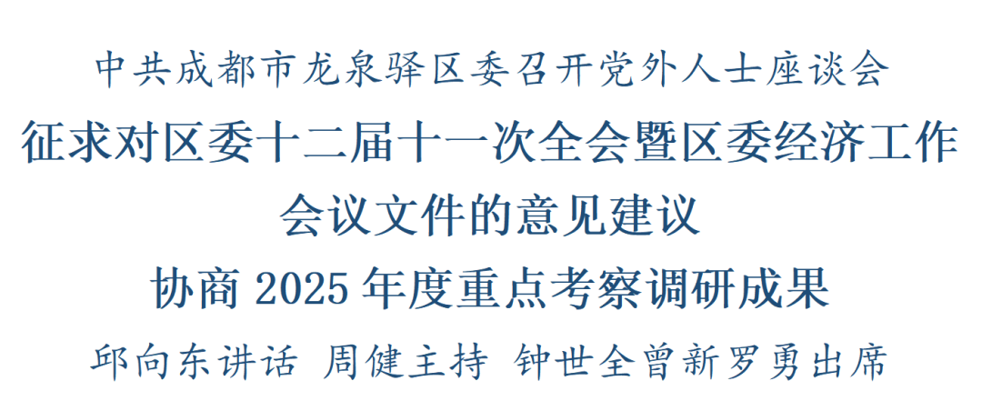 中共成都市龙泉驿区委十二届十一次全会暨区委经济工作会议举行前夕,区委召开党外人士座谈会,就全会和经济工作会议文件听取各民主党派基层组织、区工商联和无党派人士代表的意见建议,并就党外人士年度重点考察调研成果进行协商。区委书记邱向东出席并讲话。区委副书记、区长周健主持会议。区人大常委会主任钟世全,区政协主席曾新,区委副书记罗勇出席会议。