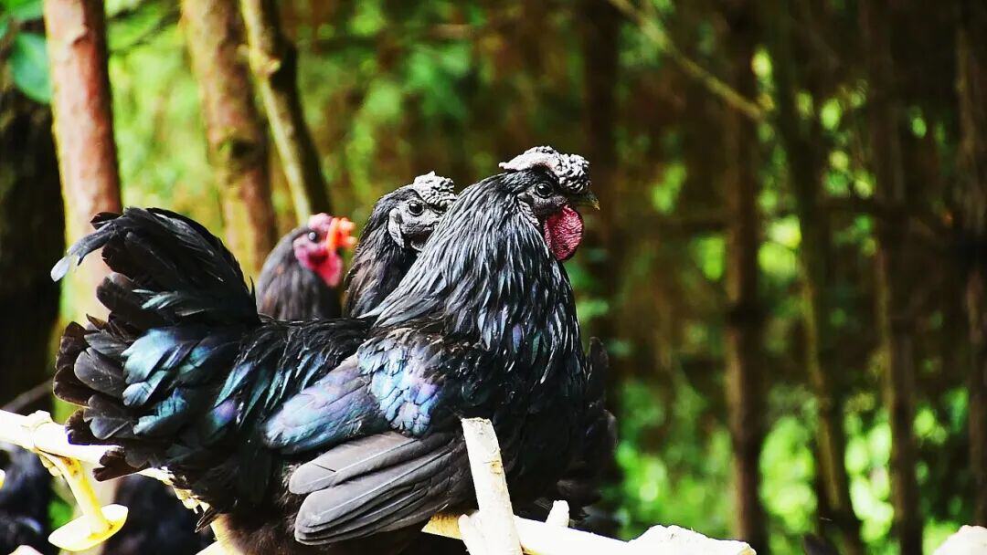 在养殖基地,鸡群常年散养于山林。公鸡体型高大、羽毛黑红光亮,母鸡通体乌黑泛翠绿光泽。行走间,公鸡如披战袍,母鸡似着绸缎,宛如古籍中走出的灵禽。