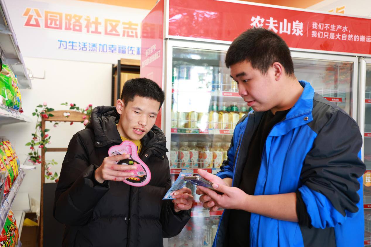 活动现场暖意融融,“心青年”在家长的陪伴下,满怀好奇地奔向各个功能区,一场热闹又认真的模拟实训即刻展开。在“爱心烘焙坊”,孩子们精心为家长挑选面包,小心翼翼地模仿收银扫码的动作,眼神里满是专注;在“暖心咖啡馆”,他们试着鼓起勇气说出“您好,请问需要点什么”,并稳稳地为客人倒上热水,每一个小小的进步都令人动容;“烟火小铺”的货架前,几位“心青年”尝试整理商品、摆放陈列,格外认真。家长们站在一旁,脸上洋溢着欣慰的笑容,纷纷用手机记录下孩子们这场意义非凡的首次“职场体验”,定格下珍贵的成长瞬间。