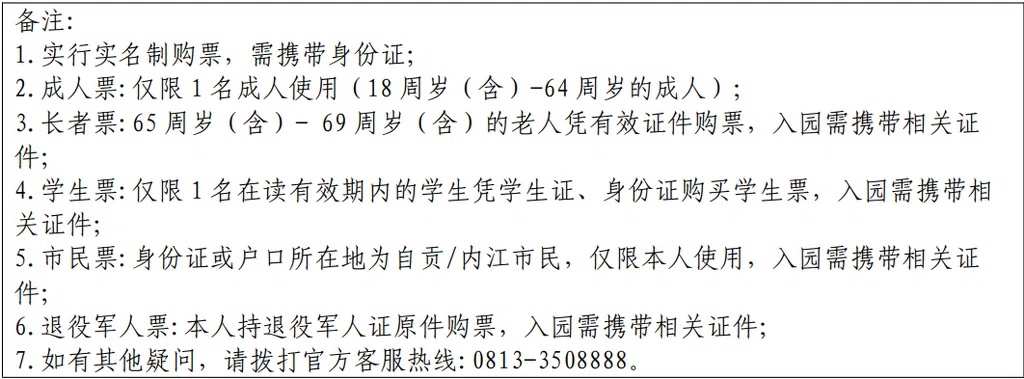 其中,免费入园人群为:1.3米(含)以下儿童(需一名购票成人陪同);70岁(含)以上老人(凭本人身份证原件);导游(当日带团导游凭导游证);消防救援人员(凭干部证、消防员证);残疾人(凭一、二级残疾证及一名陪同人员限免票一次,需到景区游客中心办理免票入园凭证);记者(凭本人有效记者证原件);现役、残疾军人(凭现役军人证、残疾军人证);烈士、因公牺牲军人、病故军人遗属(凭“三属”优待证);持人才卡人群(凭全国范围内各省级人才卡、自贡市“盐都人才绿卡”);台湾同胞(凭台湾台胞证)。