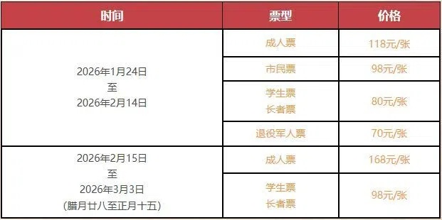 灯会票价将根据日期划分为两个时段。2月15日至3月3日春节期间,成人票168元/张,长者票、学生票98元/张。需特别注意的是,2月16日(除夕)灯会暂停开放。