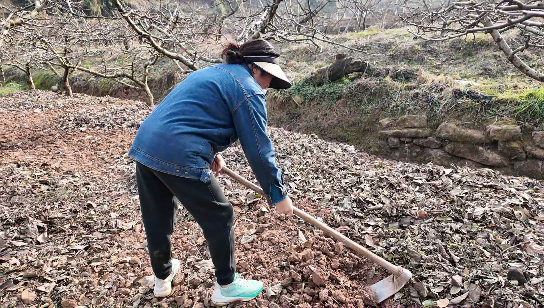村民郭小芬正在为桃树施肥做准备