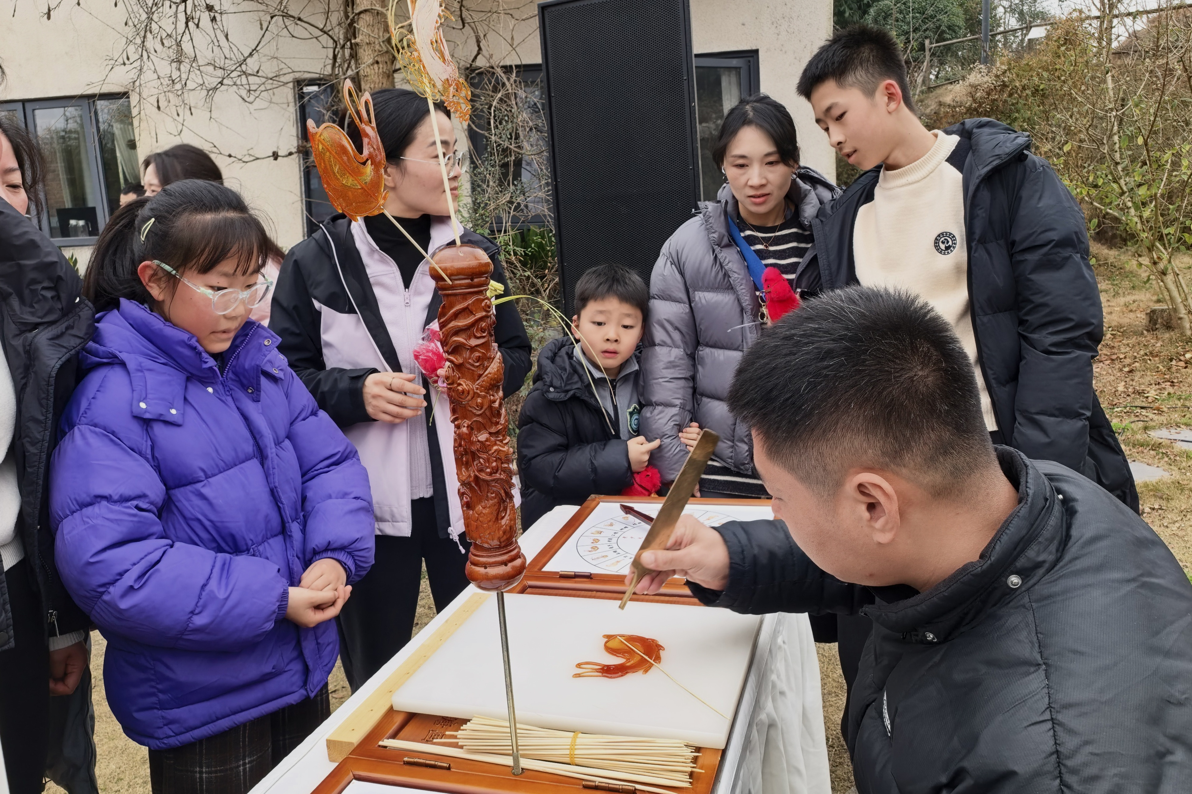 主会场更是热闹非凡。糖画摊位前围满了小朋友,老师傅手持铜勺,手腕轻转,金黄的糖浆如丝如缕落在光洁的石板上,不出两分钟,一条栩栩如生的飞龙便跃然眼前,引来一阵惊叹。隔壁棕编摊位上,青翠的棕叶在师傅指间穿梭折叠,不一会儿,一只活灵活现的蚂蚱或小鸟便递到小朋友手中,孩子们如获至宝,小心翼翼捧着。春联书写区墨香四溢。长桌铺开,红纸鲜艳。书法老师们挥毫泼墨,“春临大地百花艳,节至人间万象新”等吉祥联句一气呵成,笔力遒劲。居民们围在桌边,认真挑选心仪的联语。