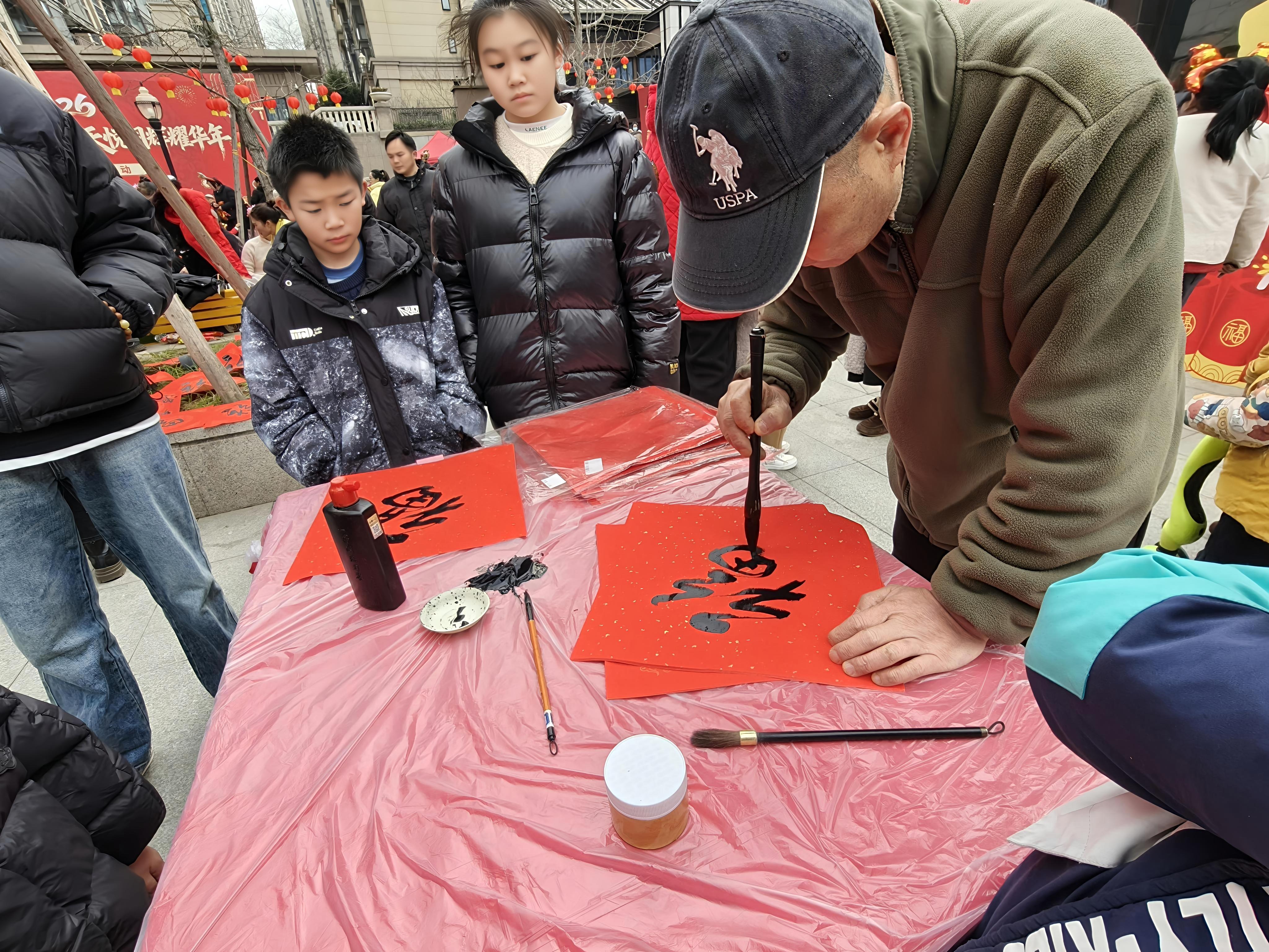 活动现场另一边也人头攒动、暖意融融,传统年俗体验区成热门打卡点。在写福字摊位,社区工作人员挥动毛笔写下祝福,居民排队领取,有人小心捧着福字,有人凑在一起欣赏;一印福字日历摊位,大人小孩亲手印制专属新春日历,将福气与祝福定格;套圈等互动游戏区排起长队,大家踊跃参与,有人命中目标赢得喝彩,没中也互相鼓劲,热闹又温馨。居民亲身体验传统民俗魅力,拉近邻里距离。