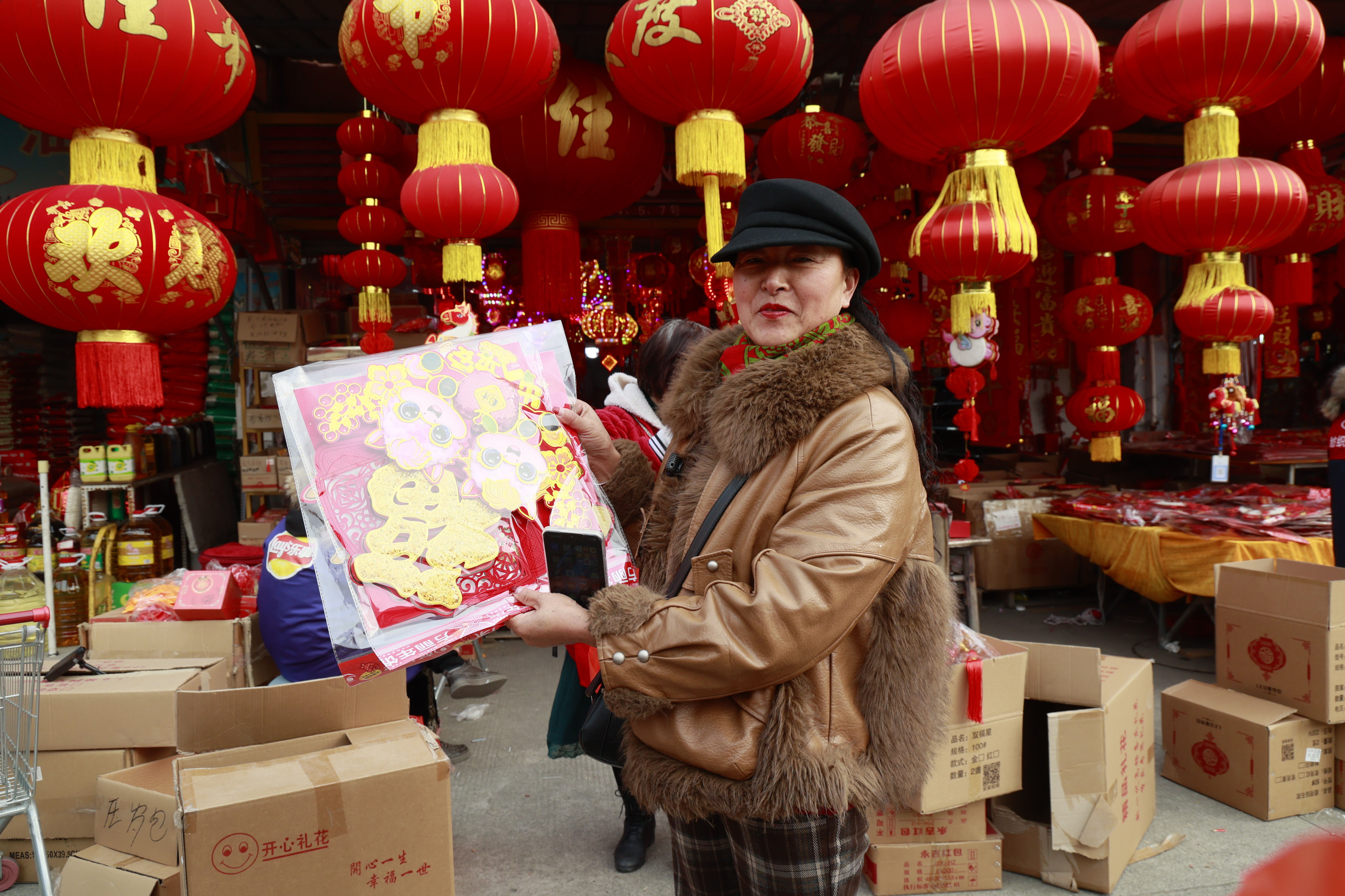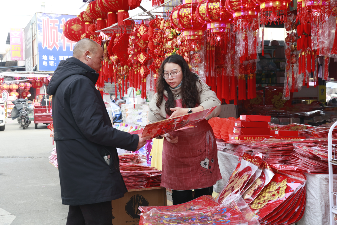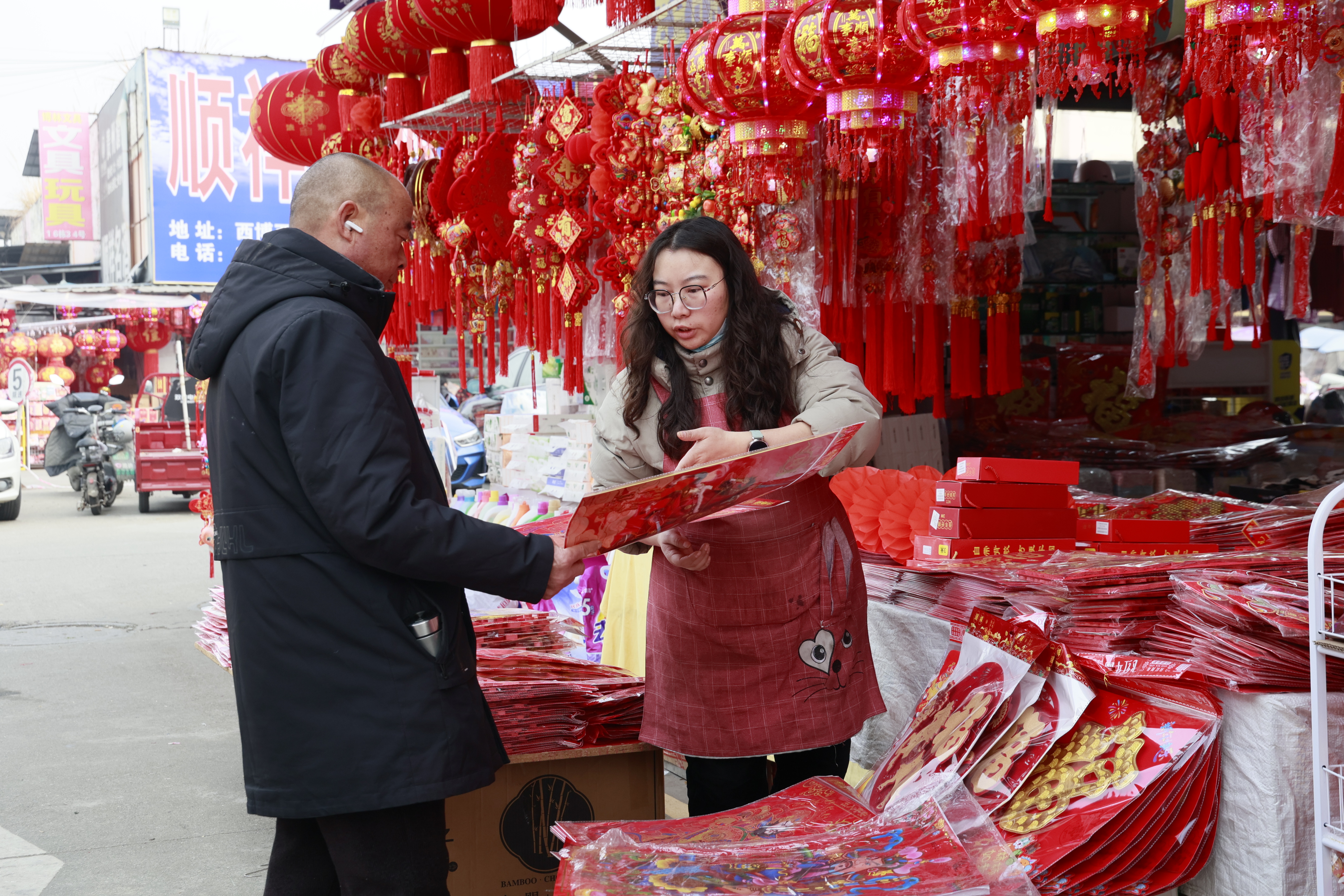 “一米二和一米六的马年对联早就卖断货了!”美满婚庆礼品行售货员陈雪蕊一边整理着红彤彤的灯笼,一边笑着说,带有“恭喜发财”字样的商用大灯笼和印着“鸿运当头”的家用小灯笼,每天都要卖出上百个。市民卢女士手里拿着刚挑好的福字,满脸笑意,“备年货,是买个盼头,是一份生活的仪式感,是一种精神寄托和情感表达,承载着人们对美好生活的向往。”