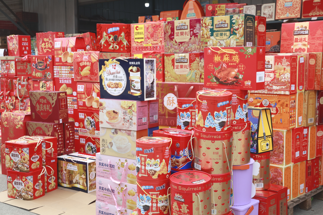 记者看到,各门店早已换上新春“盛装”,大红灯笼随风摇曳,一串串金色福字挂件熠熠生辉;货架上干果、糖果、零食大礼包堆成小山,琳琅满目。市民们的欢笑声,商家的吆喝声此起彼伏,零食干果的香气便扑面而来,勾勒出一幅充满烟火气的新春画卷。