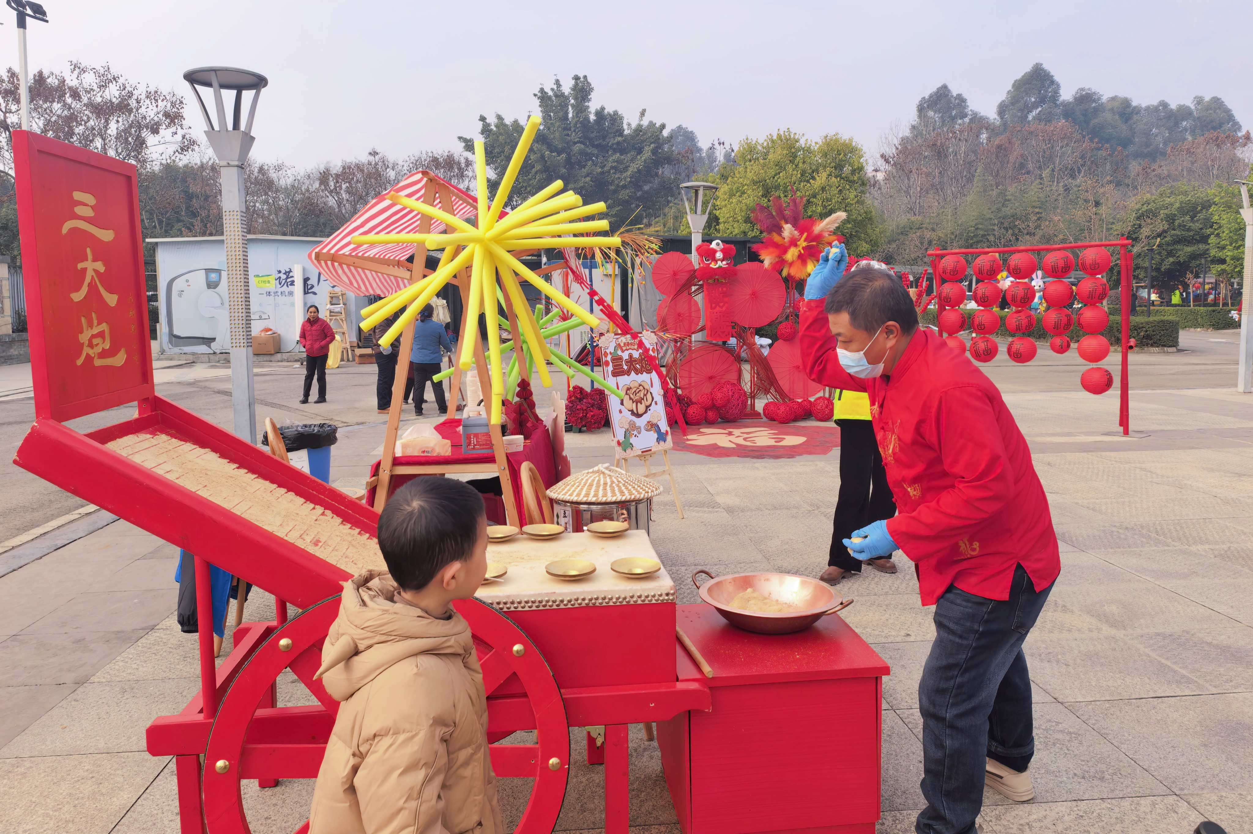 活动现场精心设置了多元特色环节,让参与者在趣味互动中收获快乐与健康。甜蜜美食区里,非遗三大炮现场演绎,糯糯的糍粑裹上黄豆粉,淋上香甜糖浆,一口解锁童年年味;趣味游戏区更是人气爆棚,猜灯谜、投壶多福、丢沙包、喜钓锦鲤、趣味套圈等经典项目依次排开,家长与孩子默契协作、携手闯关,每完成一个项目就能赢得一枚印章,集齐印章可兑换新年暖心好礼,在欢声笑语中增进了亲子感情,也收获了满满的幸福感。此外,深受小朋友喜爱的花车巡游同步进行,卡通人物萌态十足,与现场小朋友亲切互动、合影留念,定格下一个个温馨有趣的瞬间。