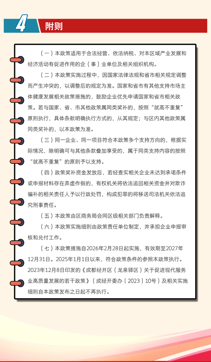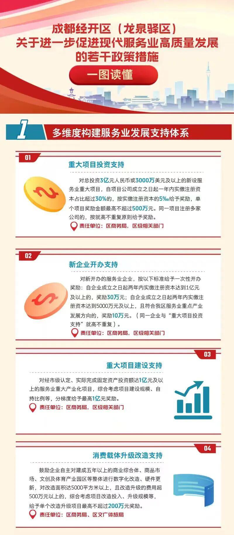 为全面落实中央、省市战略部署,抢抓服务业发展机遇,近日,成都经开区商务局等12部门联合印发《成都经开区(龙泉驿区)关于进一步促进现代服务业高质量发展的若干政策措施》。该政策围绕“服务业倍增发展”核心目标,推出“真金白银”的系列支持举措,共包含三大板块、39项具体支持措施。