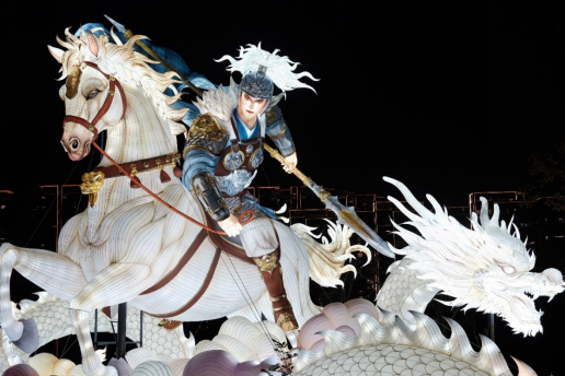 漫步灯会,移步易景、各有韵味。其中,《神骏出东方》灯组以“五星出东方”汉代织锦护臂纹样为灵感,呈现神骏从锦缎中跃然而出的壮观景象;《子龙攻坚尤可效》灯组生动再现“常胜将军”赵子龙白袍银枪、锐不可当的绝世雄姿;《人面桃花相映红》灯组中,桃花仙子灵动“眨眼”,再现“人面桃花相映红”的经典诗意;《茶马远行织锦绣》灯组以川北皮影技艺融合马帮文化,光影流转间诉说茶马传奇……