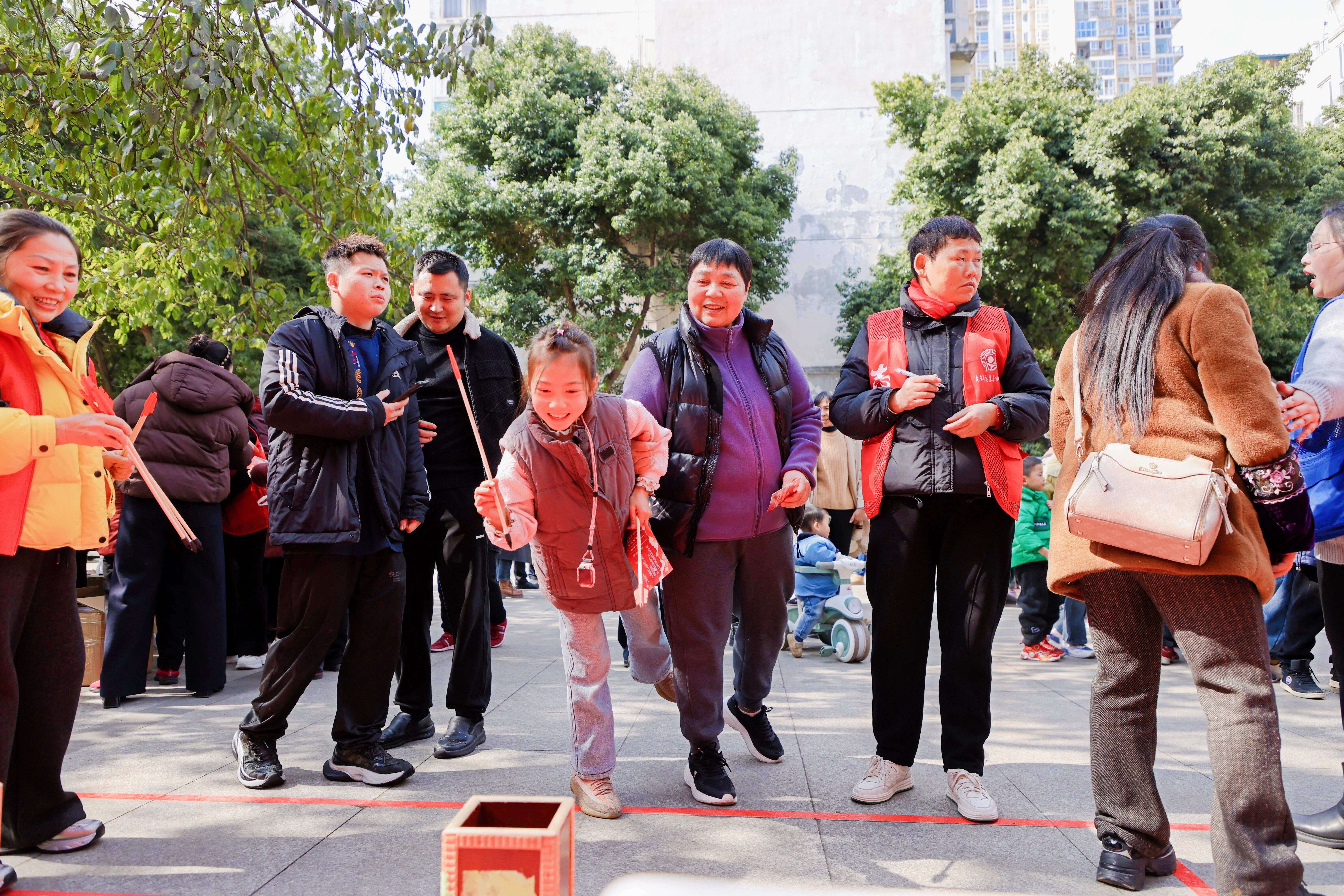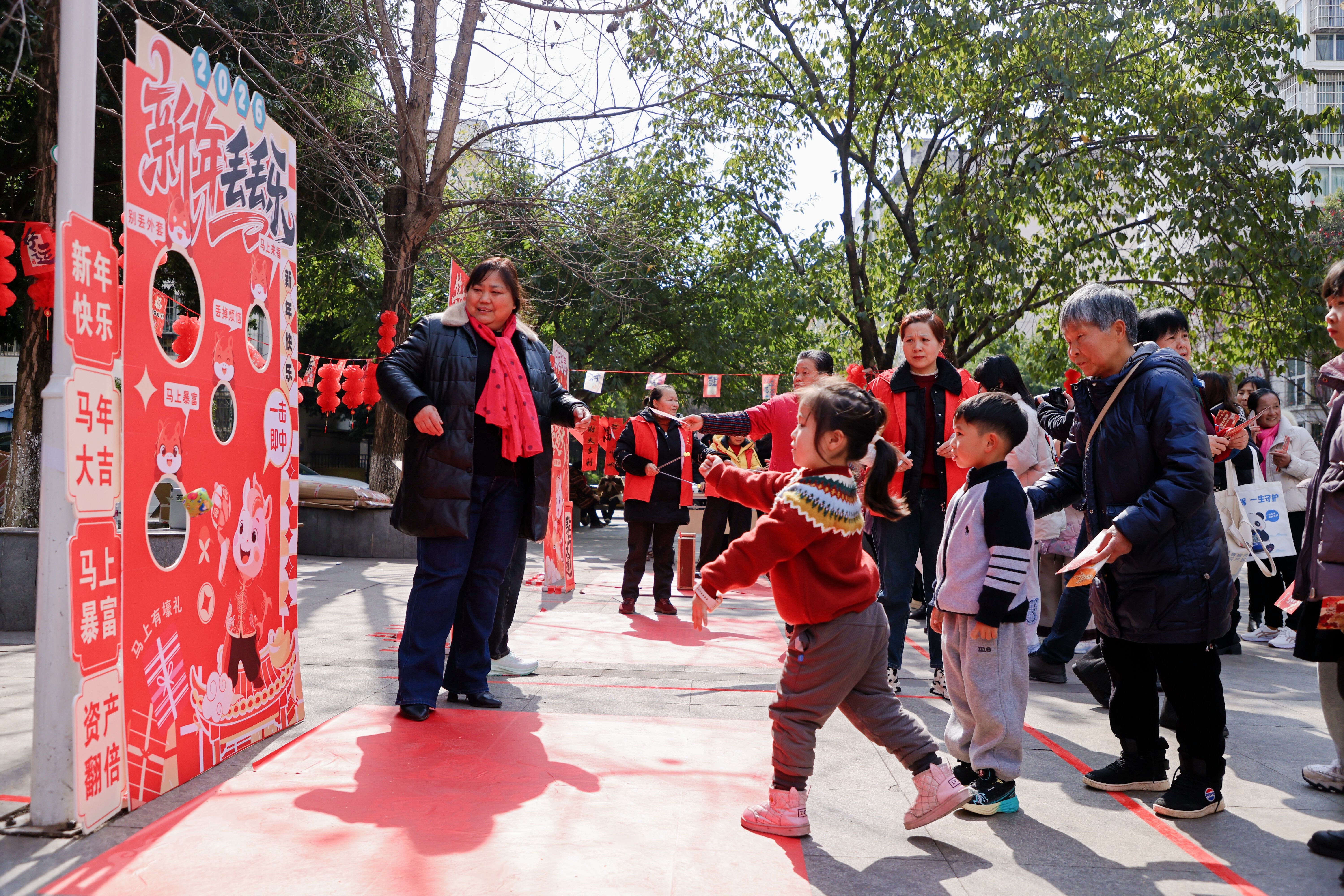 新春年货套圈区最为抢手,米、面、油、春联礼包等实用年货整齐排列,大人小孩手持套圈,凝神聚力、瞄准投掷,时而传来欢呼喝彩,时而响起暖心鼓励,小小的套圈不仅套住了惊喜礼品,更套住了邻里间的欢乐时光。马年大吉好运投壶区,仿古投壶静置摆放,居民们抬手投箭,在还原传统民俗的同时,祈愿马年顺遂,投中后的雀跃声此起彼伏。