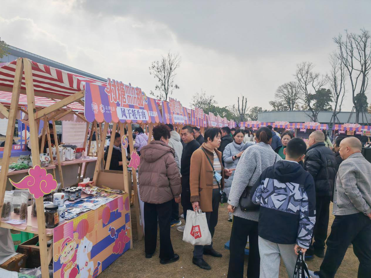 走进市集,浪漫粉紫色调与红灯笼相映成趣,新春氛围感拉满。美食区早已香气四溢,成为最具人气的核心区域 —— 酸辣鲜香的伤心凉粉裹满红油,Q弹爽滑;老字号光洪兔火锅兔头卤香醇厚,麻辣过瘾;洛带宝胜村的大头菜咸香脆嫩,袋装、真空包装的各式产品整齐陈列;还有风干牦牛肉、手工糖画等特色小吃集结,每个摊位前都排起热闹长队。