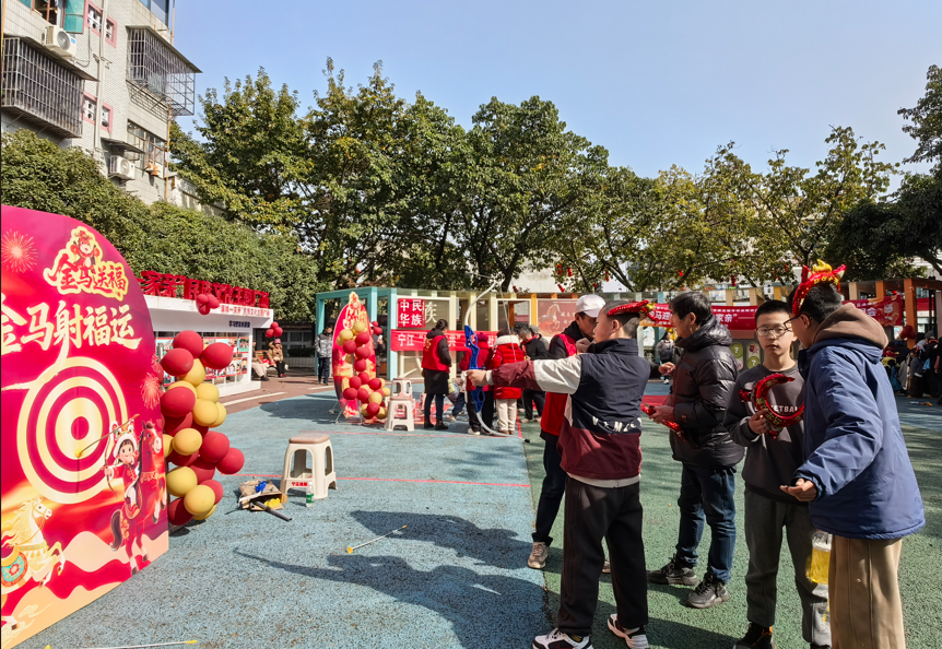 活动初始,气势恢宏的金马战鼓表演《精忠报国》拉开序幕,铿锵有力的鼓点奏响了新春游园的序曲,游园会“马上圈福”互动游戏,融入烟花爆竹安全管理知识,让安全理念伴随新春祝福一并传递。游园会上设置“金马射福”、“知识问答”、“同心一家亲打卡墙”等互动环节,居民参与通关可获得民俗文化和美食互动体验券,开启别具一格的新春民俗体验之旅。