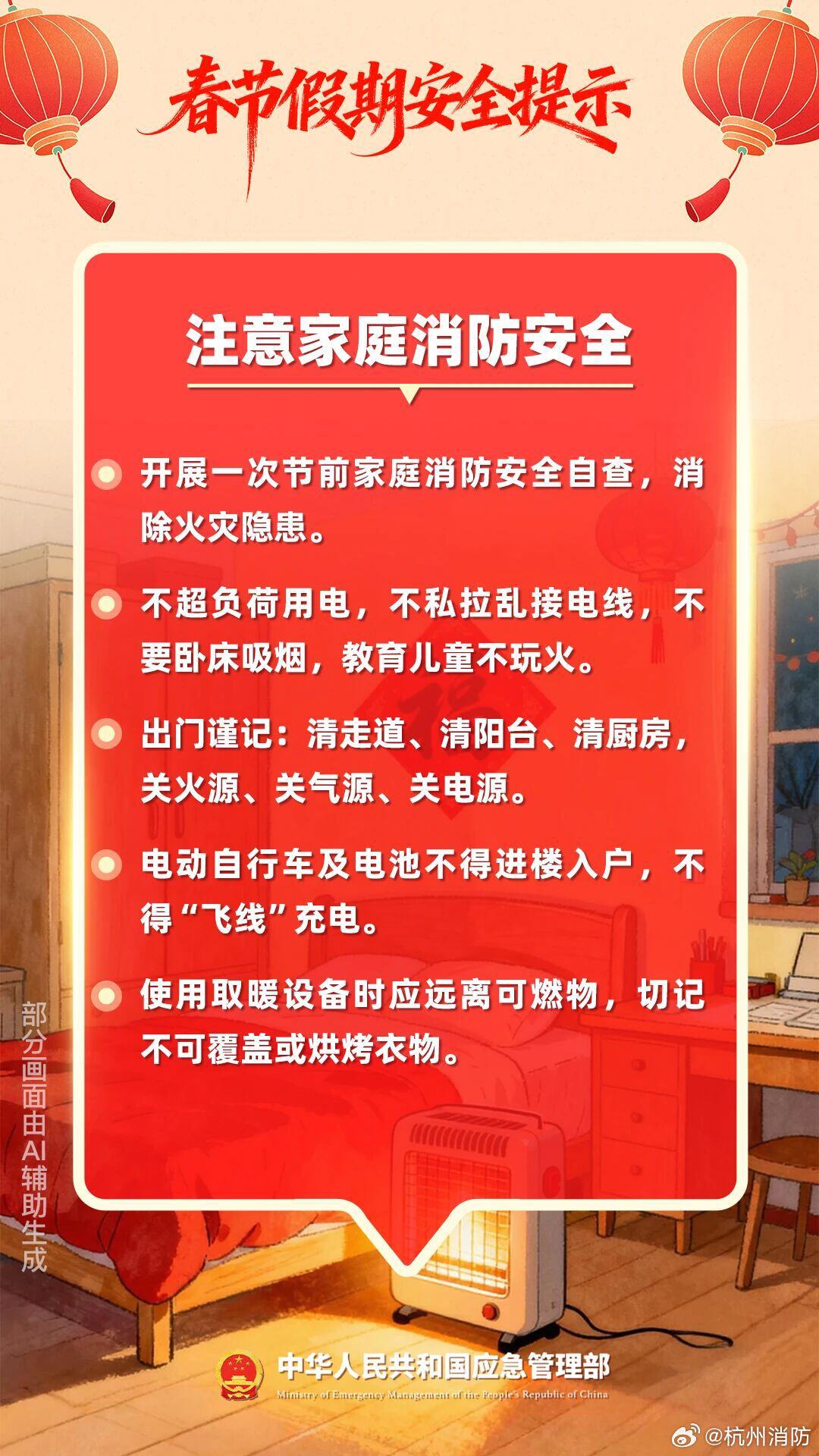 厨房烹饪不离人,取暖器远离窗帘、被褥等可燃物,不私拉乱接电线,电动车不进楼、不入户、不飞线充电;