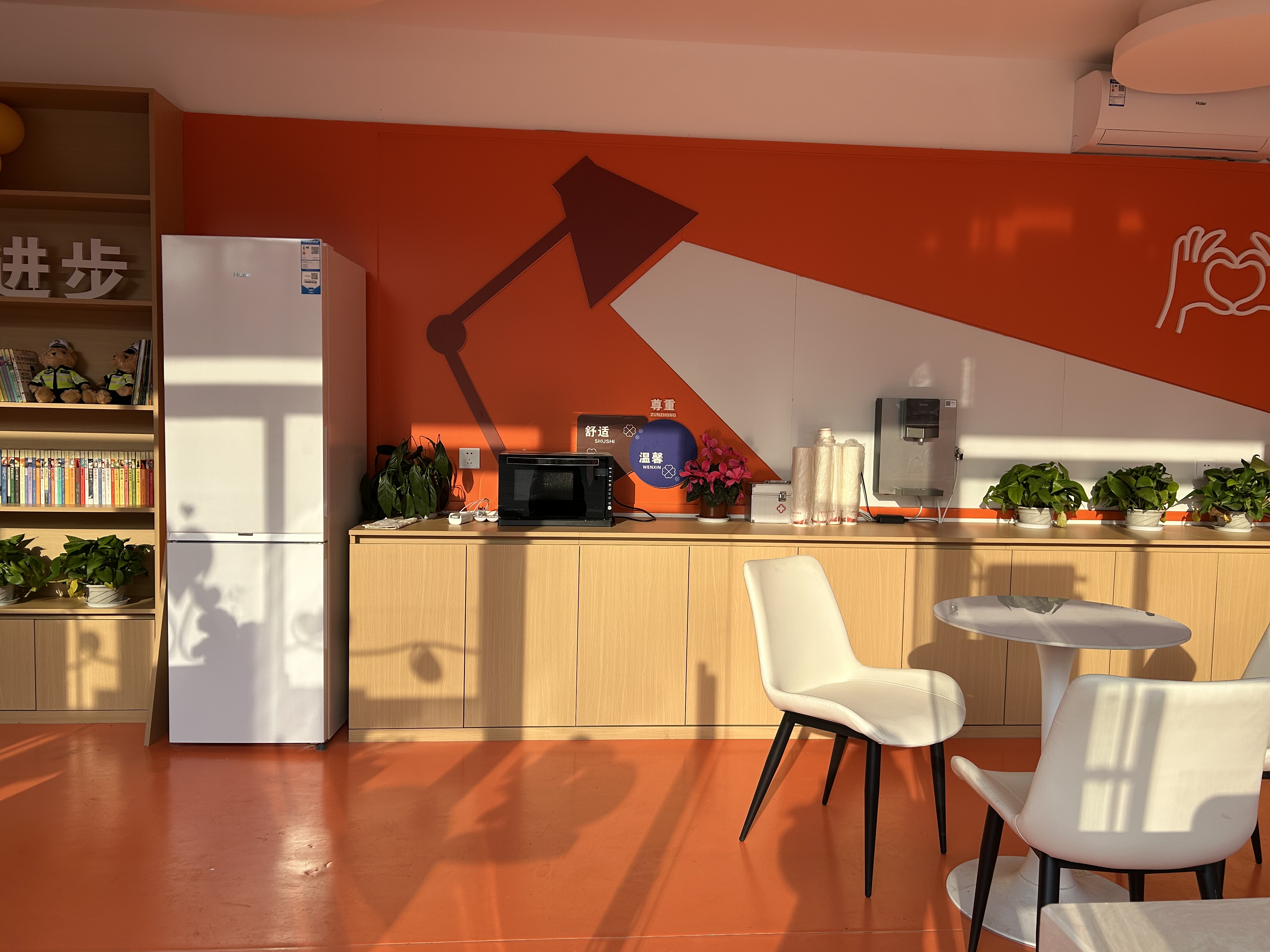 站内配备休息桌椅、图书角、微波炉、冰箱、应急药箱等完善设施,免费提供饮水、充电、热饭、临时休憩等贴心服务,让奔波在城市街头的劳动者,随时都能有一个遮风避雨、补充能量的温馨落脚点。
