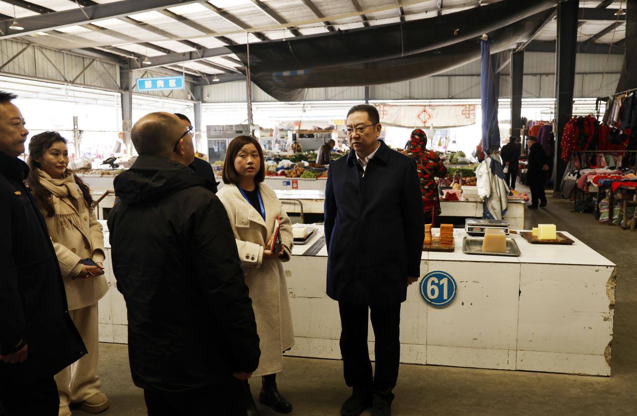 在黄土综合农贸市场,曾新实地查看节日商品供应、价格走势、食品安全管控与消防安全措施落实情况,详细询问食材采购、检验检测、经营管理等环节工作。他强调,要严把食品安全关、稳价保供关、消防安全关,全力守护群众“舌尖上的安全”,保障节日市场平稳有序。