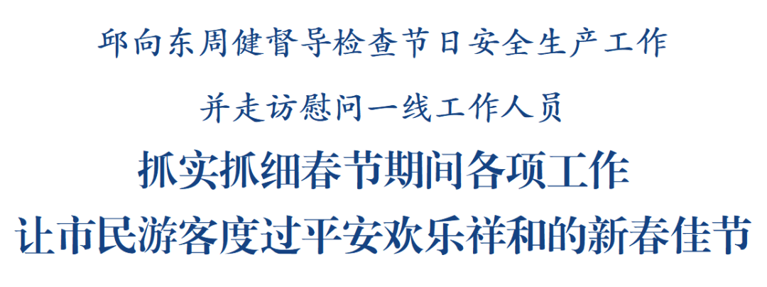 春节前夕,区委书记邱向东,区委副书记、区长周健分别督导检查安全生产工作并走访慰问一线工作人员。邱向东强调,要深入学习贯彻习近平总书记关于安全生产的重要论述和春节前夕在北京看望慰问基层干部群众时的重要讲话精神,全面落实党中央国务院和省委省政府、市委市政府部署要求,以“时时放心不下”的责任感抓实抓细春节期间各项工作,让市民群众和广大游客度过一个平安、欢乐、祥和的新春佳节。