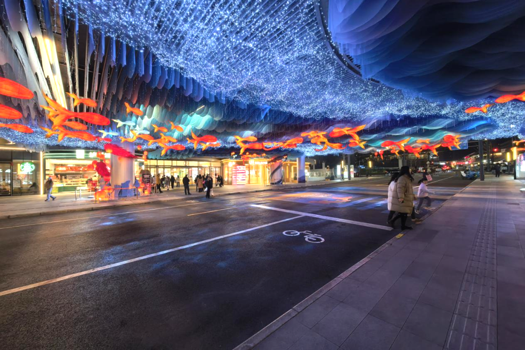 春节期间,龙湖东安天街AB馆连廊处“鲤跃星河鸿运安年”国风鱼灯庙会,成为新春顶流打卡地。“太惊艳了!这些锦鲤灯随手一拍都是大片。”正在打卡的市民李女士忍不住赞叹。而从2号门步入杉杉奥特莱斯广场,一棵巨型“鎏金发财树”率先映入眼帘,金灿灿的枝叶缀满吉祥装饰,成为市民沾福气、讨彩头的热门打卡点。