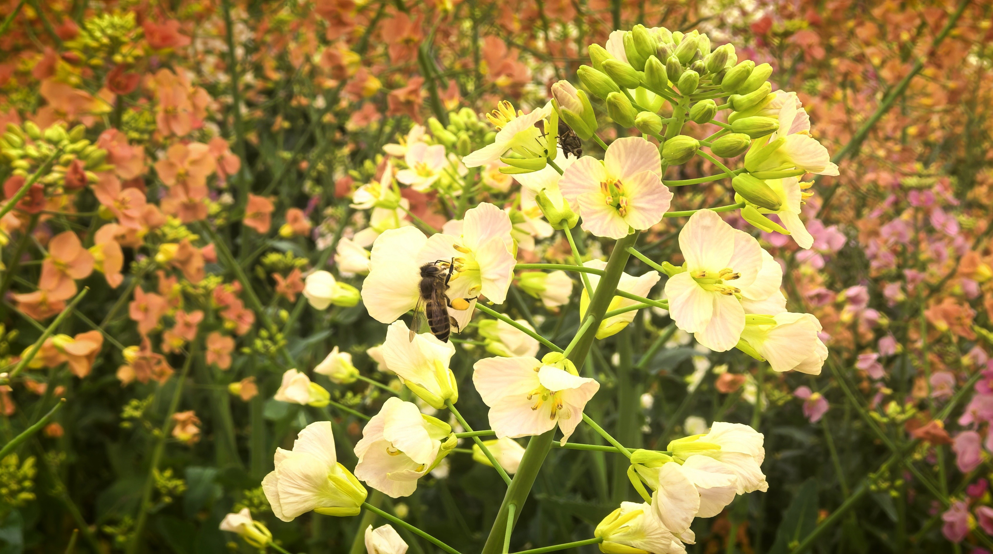记者在现场看到,这片色彩斑斓的油菜花海与传统的黄色油菜花不同,这里的花田呈现出丰富的色彩层次,宛如打翻了大自然的调色盘。微风吹过,花浪起伏,花香四溢,蜜蜂在花间忙碌穿梭,构成了一幅生机勃勃的春日图景。