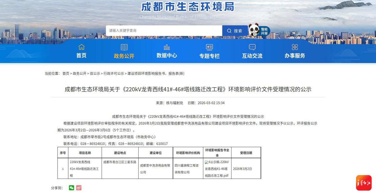 2026年3月2日下午3点34分,成都市生态环境局挂网公示