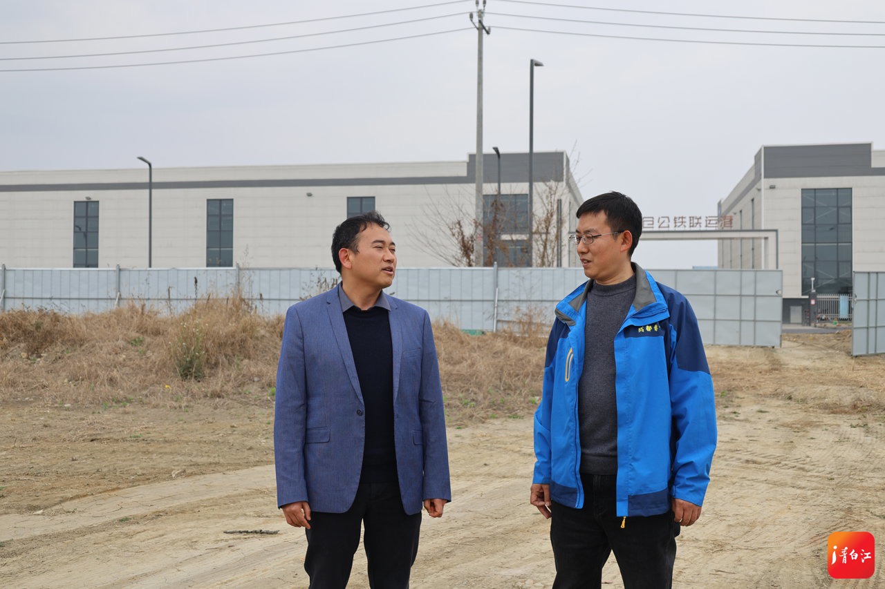 陈斌(左)到项目工地现场了解情况