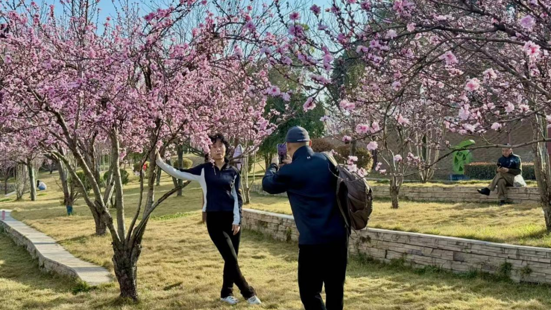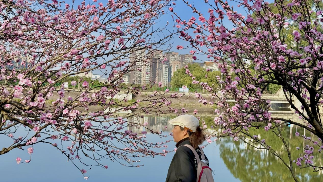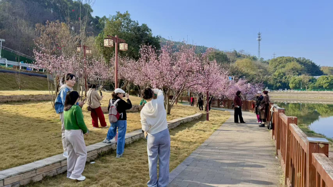 在位于飞龙湖水库的钟家山森林步道入口处,连片桃树繁花满枝,花瓣轻扬、暗香浮动。步道上、湖岸边、观景台处处可见游人身影,大家或漫步花径、或驻足留影,尽享春日美好。不少市民带着家人、约上好友,用镜头定格桃花与湖水同框的浪漫画面,欢声笑语回荡在花海之间。