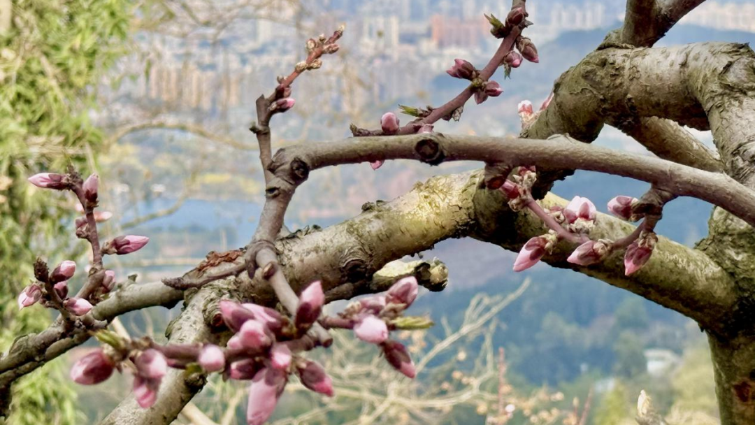 由于凉风垭海拔相对较高,目前这里的桃花还在最后的“沉睡”中。一株株桃树结满了花苞,朵朵将开未开,只有少许桃花的花骨朵在顶端有微微泛红,预计中旬迎来盛放。