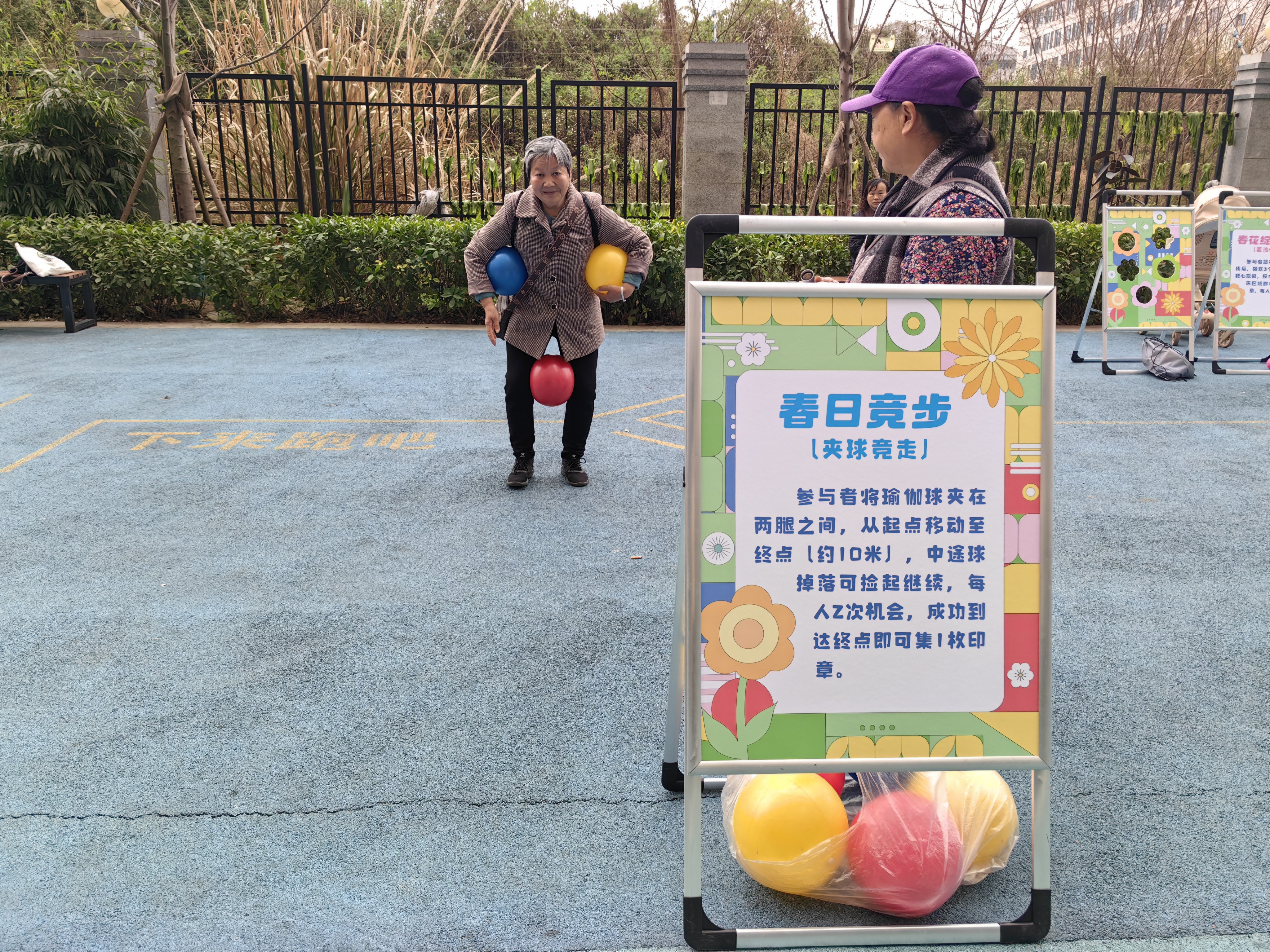 趣味游戏乐不停,邻里互动零距离。“春日趣玩乐园”设置了春轮滚滚、春花绽放、春溪踏石、春日竞步、春风击瓶五大经典趣味游戏,覆盖不同年龄段居民的游玩需求。滚铁环唤起了中老年居民的童年回忆,大家手持铁环钩稳步推动铁环,在欢声笑语中重温儿时快乐;丢沙包、夹球竞走、搬石过河等游戏则让小朋友们跃跃欲试,现场欢笑声四起。每位居民完成游戏挑战后可收集一枚印章,集齐印章即可参与盲盒抽奖让大家收获满满惊喜。