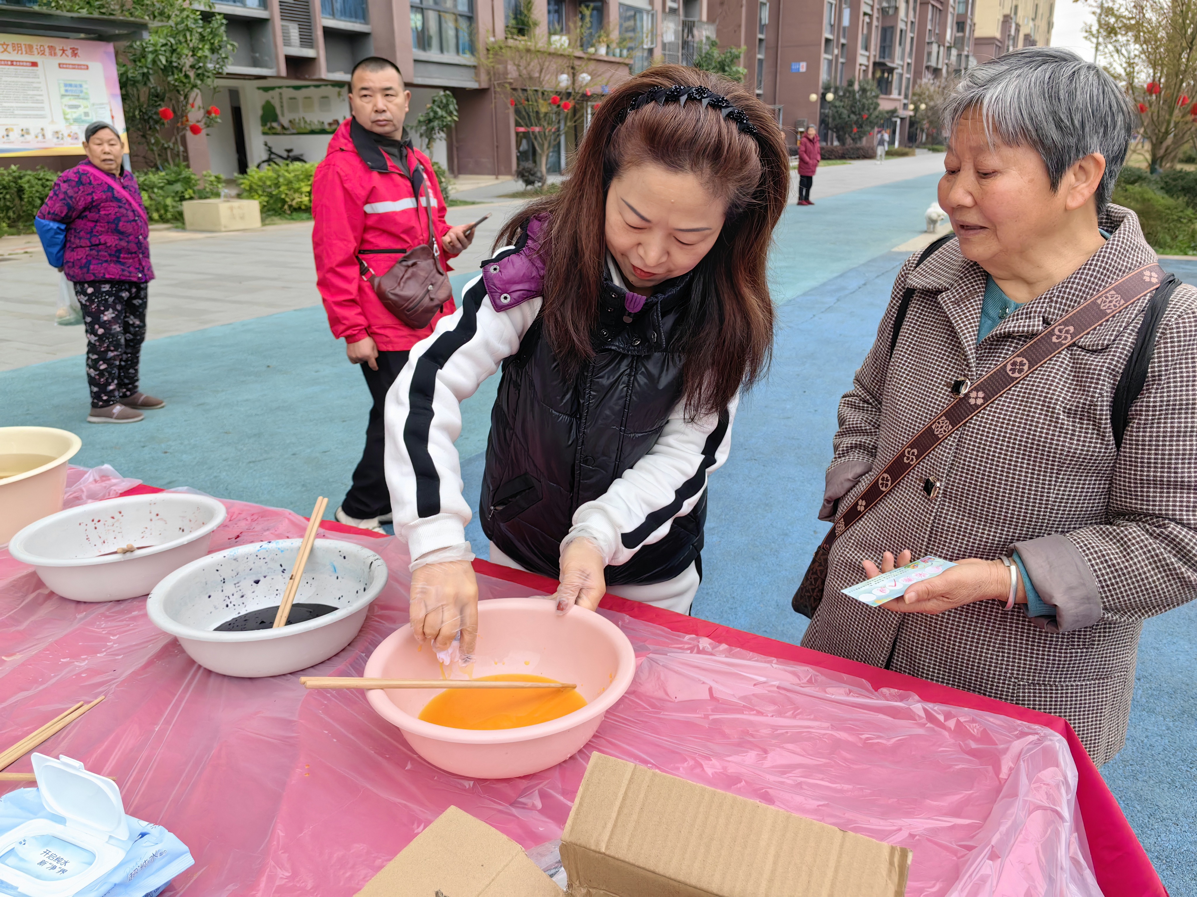 巧手造美好,温情暖人心。活动现场的“春日巧手工坊”成为人气打卡点,两大手工体验项目各有特色。扎染发圈作为三八节专属体验,吸引了众多女性居民参与,志愿者手把手教学,大家亲手制作出独一无二的扎染发圈,在体验手工乐趣的同时,收获了专属春日美好。编织马扎区域则成为老年居民的“聚集地”,现场提供马扎框架、编织绳等材料,志愿者耐心讲解编织方法,老人们围坐在一起切磋手艺、畅谈家常,氛围十分融洽。大家纷纷表示,自己制作的马扎可随身携带使用,兼具实用性与纪念意义。