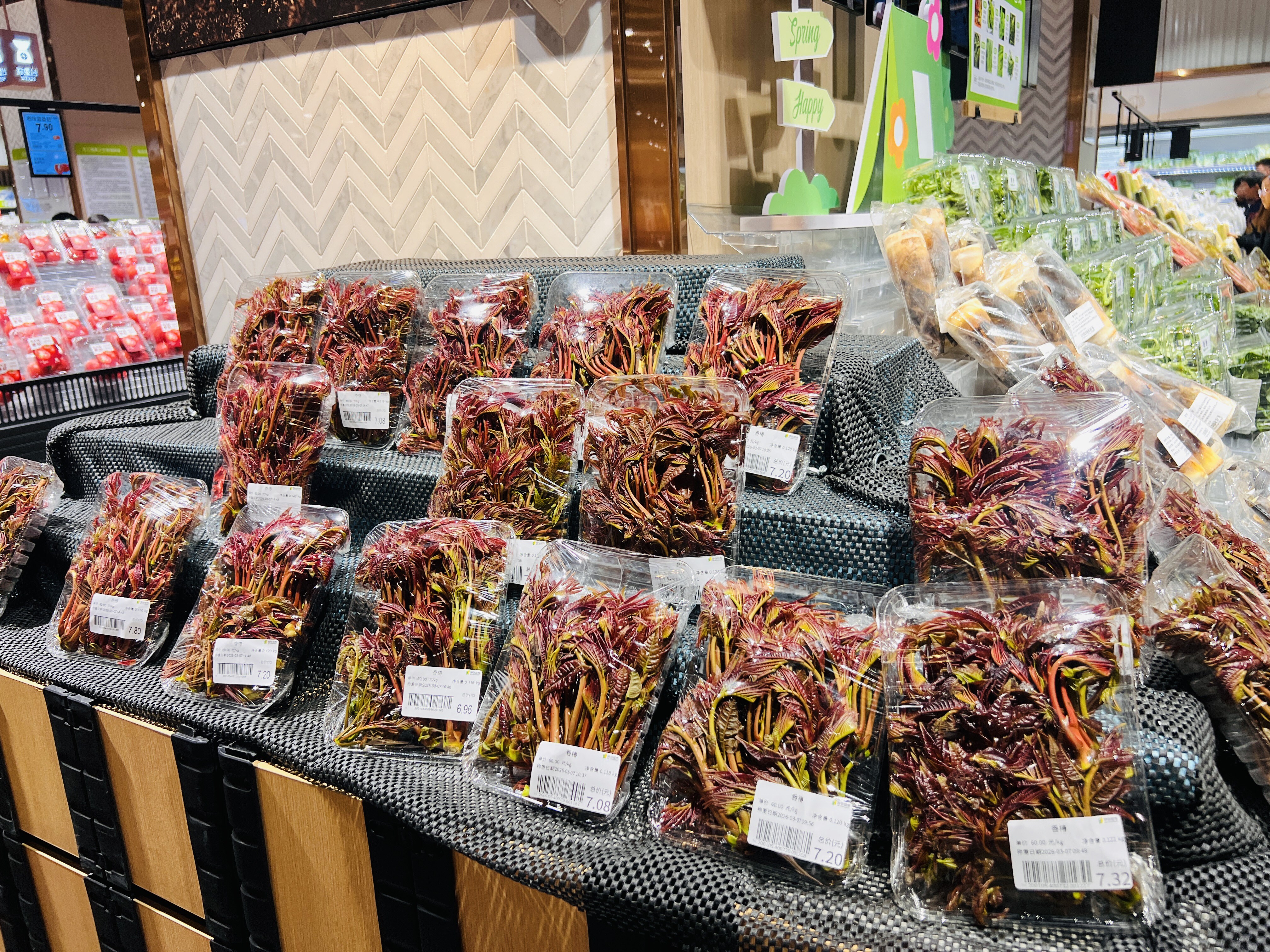 与农贸市场的热闹不同,龙泉驿区大型超市的“春鲜正当时”主题专区更显精致有序,成为市民尝鲜的另一大热门选择。在龙湖东安天街邻你超市,阶梯式春菜堆头格外醒目,暖白灯光将香椿的紫红、冰草的翠绿映衬得格外鲜亮。