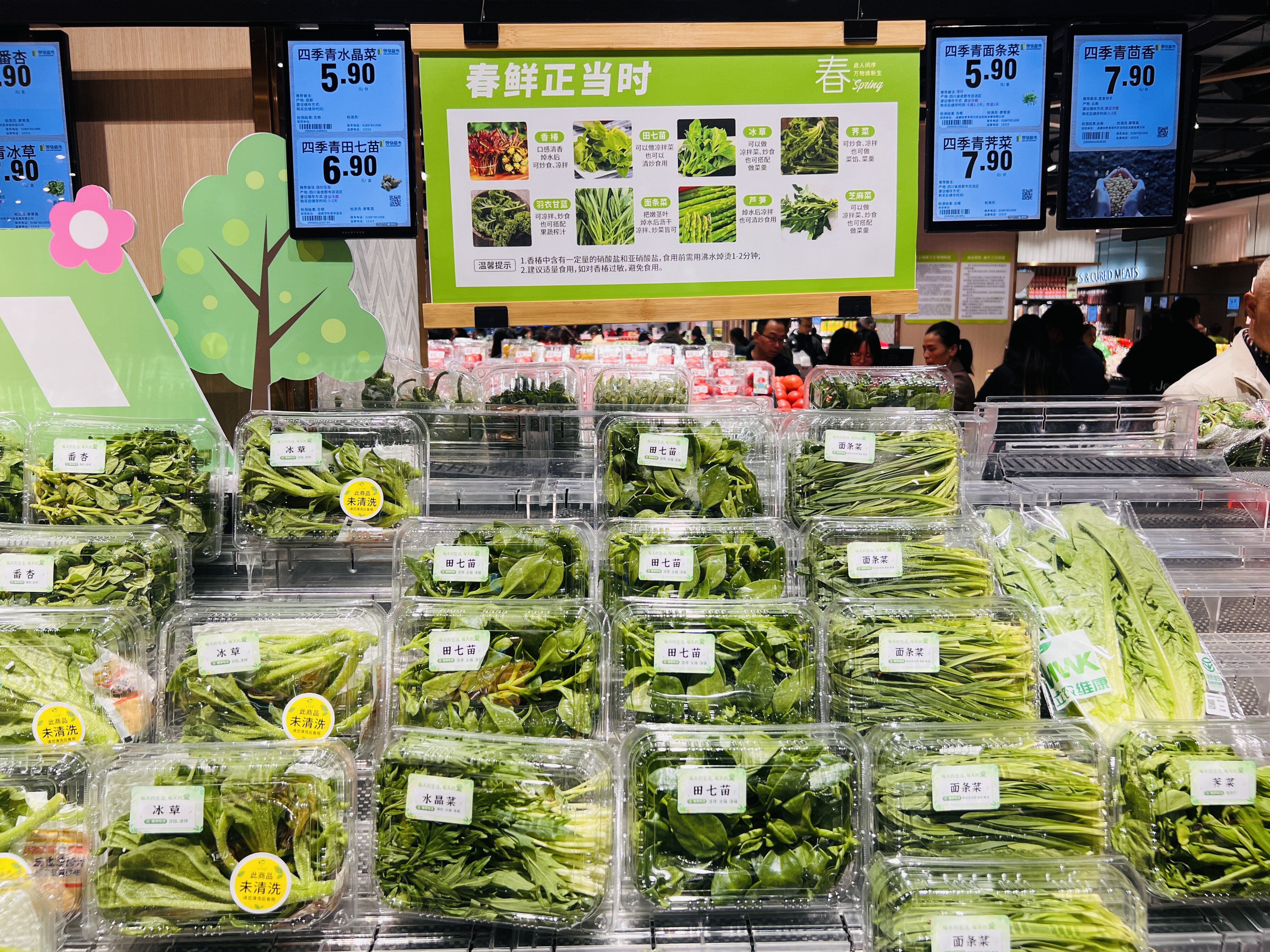 春菜专区陈列出香椿、番杏、田七苗、冰草、荠菜、羽衣甘蓝、面条菜、芦笋芝麻菜多种菜品,均采用小份包装,方便上班族和小家庭选购,每款包装盒上还有做法提示。“春菜专区分类清晰,方便‘一站式’选购。”正在选购春菜的市民王女士说。