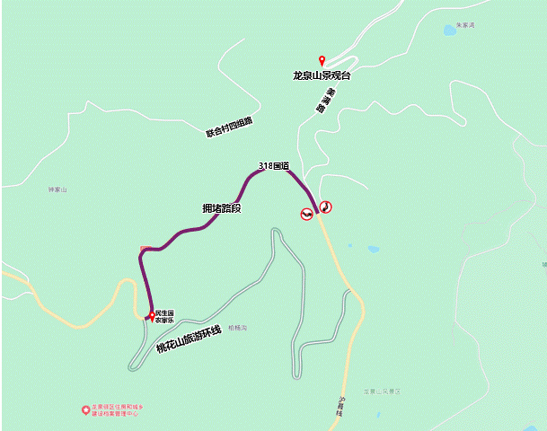 若驾车在此点位遇交通拥堵,建议选择G76成渝高速、成简快速路等道路经318国道龙泉山后山路段前往桃花故里景区。