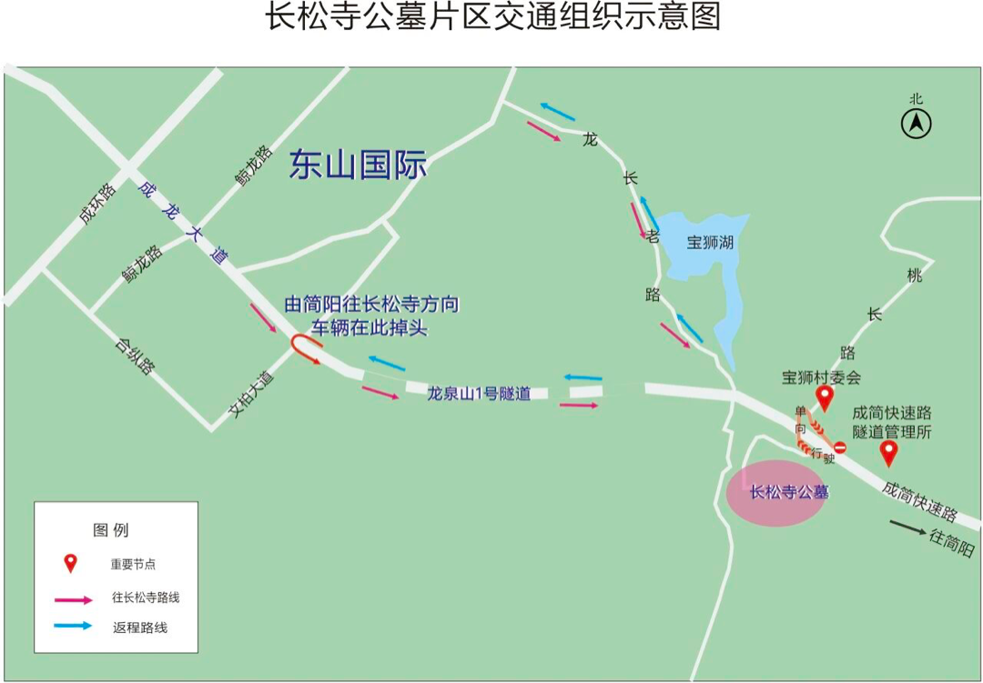3.若已驶入易堵路段,建议按现场交通信号指引分道行驶。往简阳方向车辆在左侧道路通行,往长松寺祭扫车辆使用右侧道路行驶。