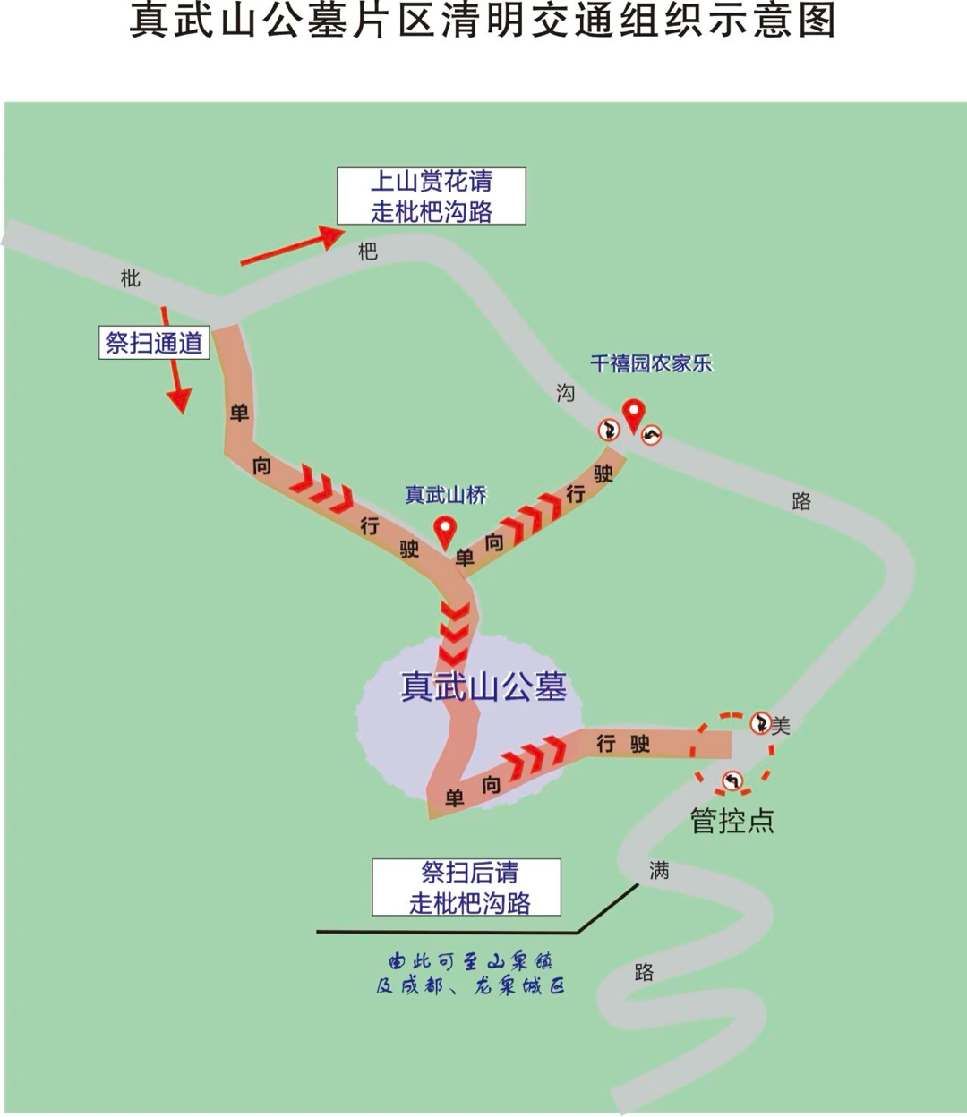 2.需经枇杷沟路、美满路前往龙泉山赏花的车辆请留意道路交通指引,避免驶入公墓拥堵路段内。