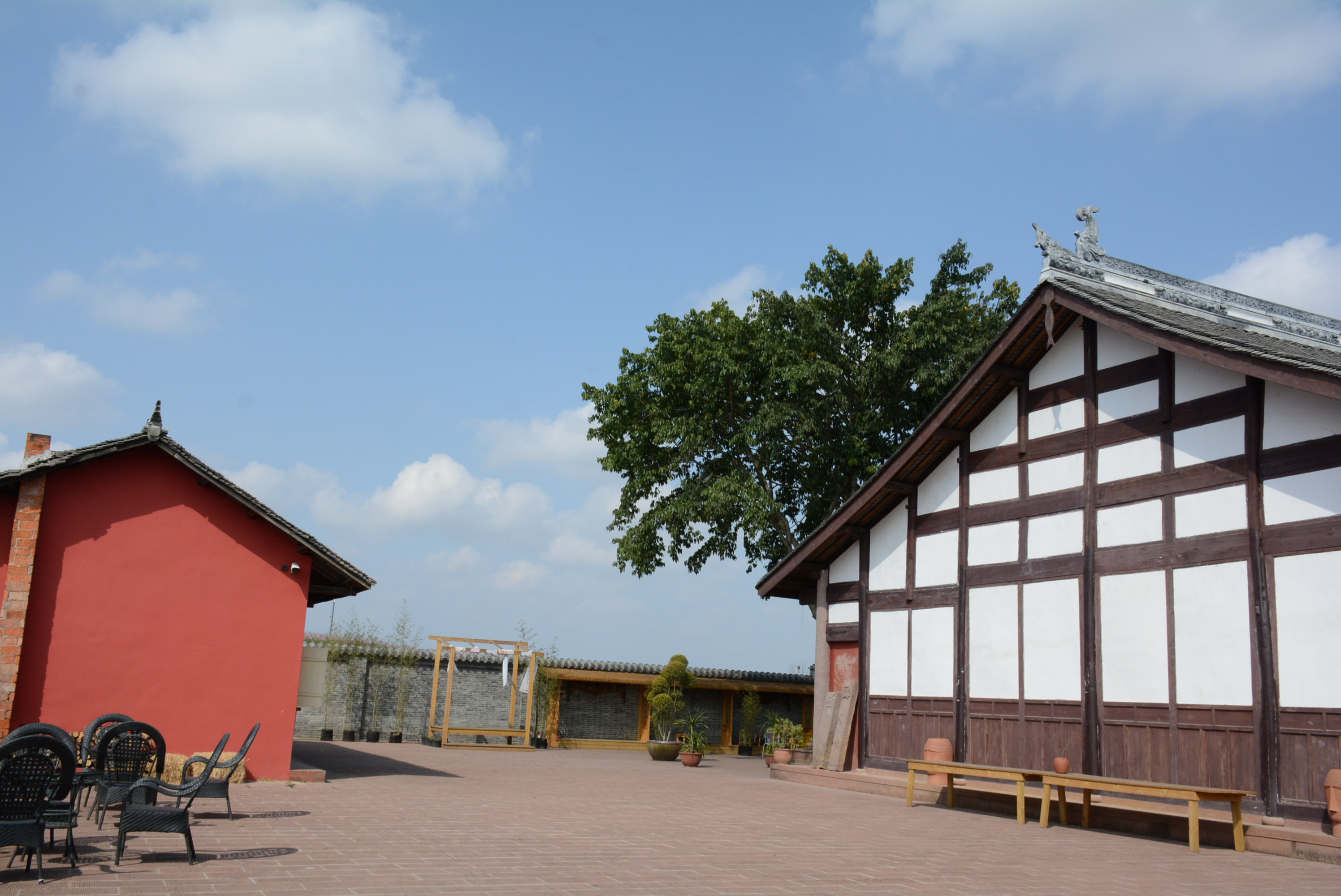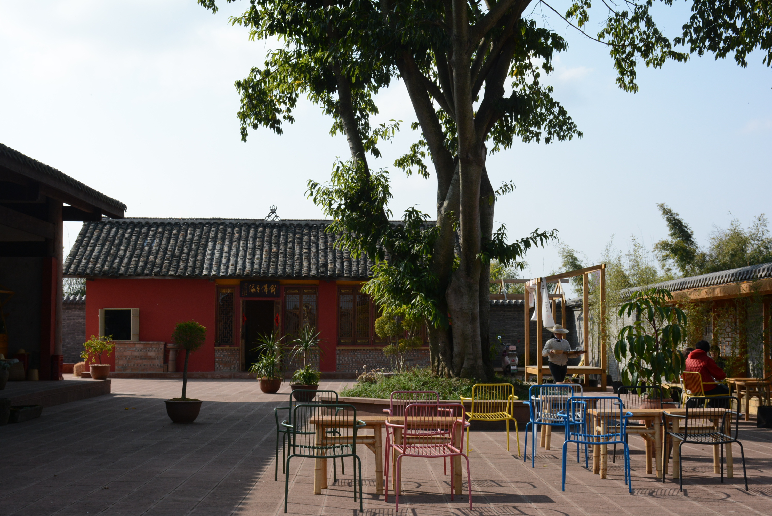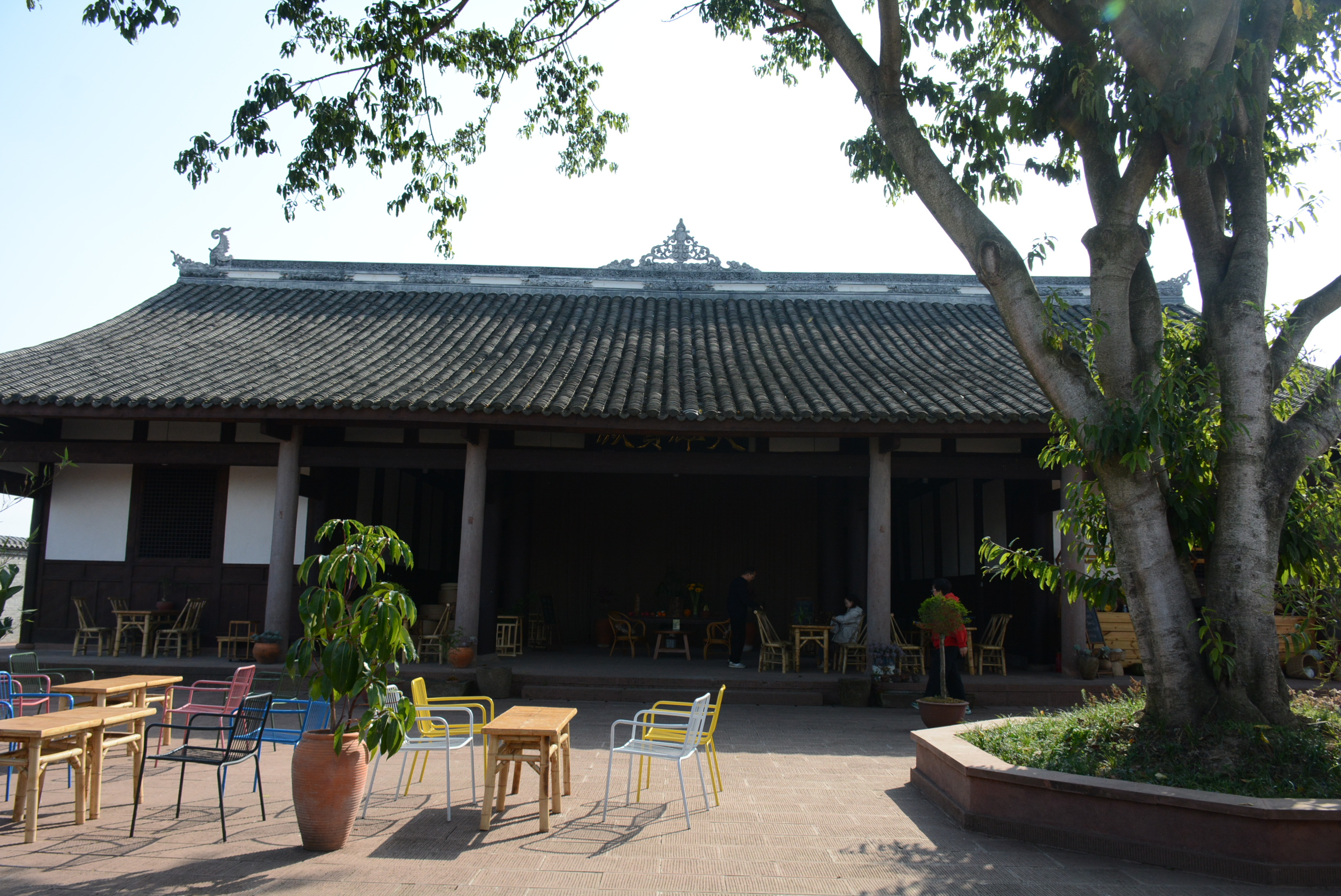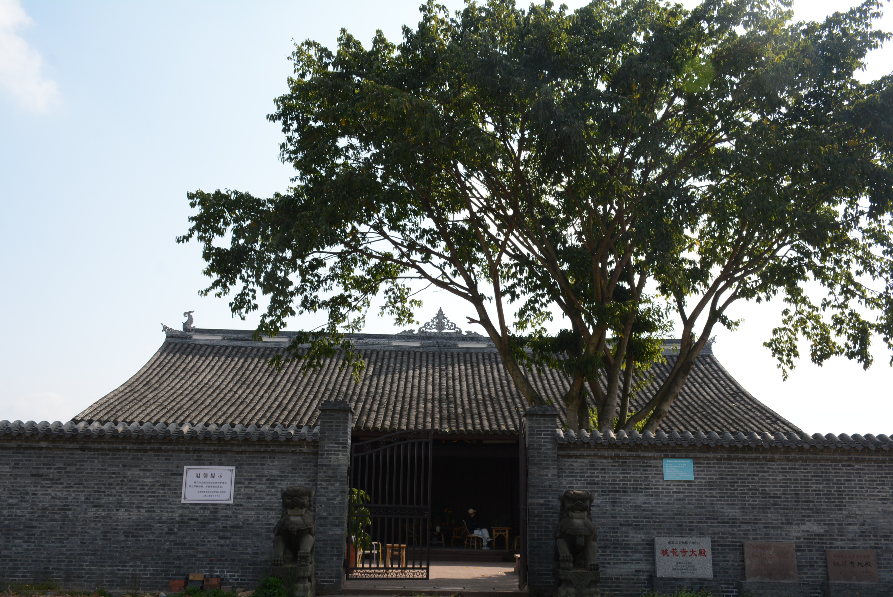 从洛带古镇蜿蜒向北,穿过一片片或金黄或碧绿的农田,便到了宝胜村。村子深处,藏着一座初建于唐朝,如今被列为成都市第六批文物保护单位的古寺——桃花寺。飞檐斗拱、白墙青瓦,一株参天的黄葛树撑起一院绿荫。树下,竹椅竹桌、彩色钢椅随意散落,青砖砌成的围墙下,藤编坐垫上有人斜倚翻书,有人闭目听风。茶香袅袅中,时光仿佛被按下了慢放键。