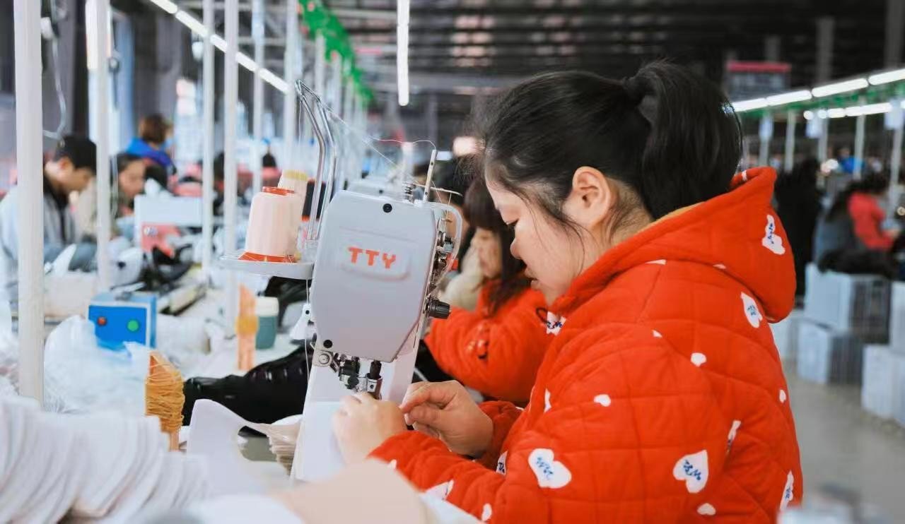 在鞋企里认真工作的职工。