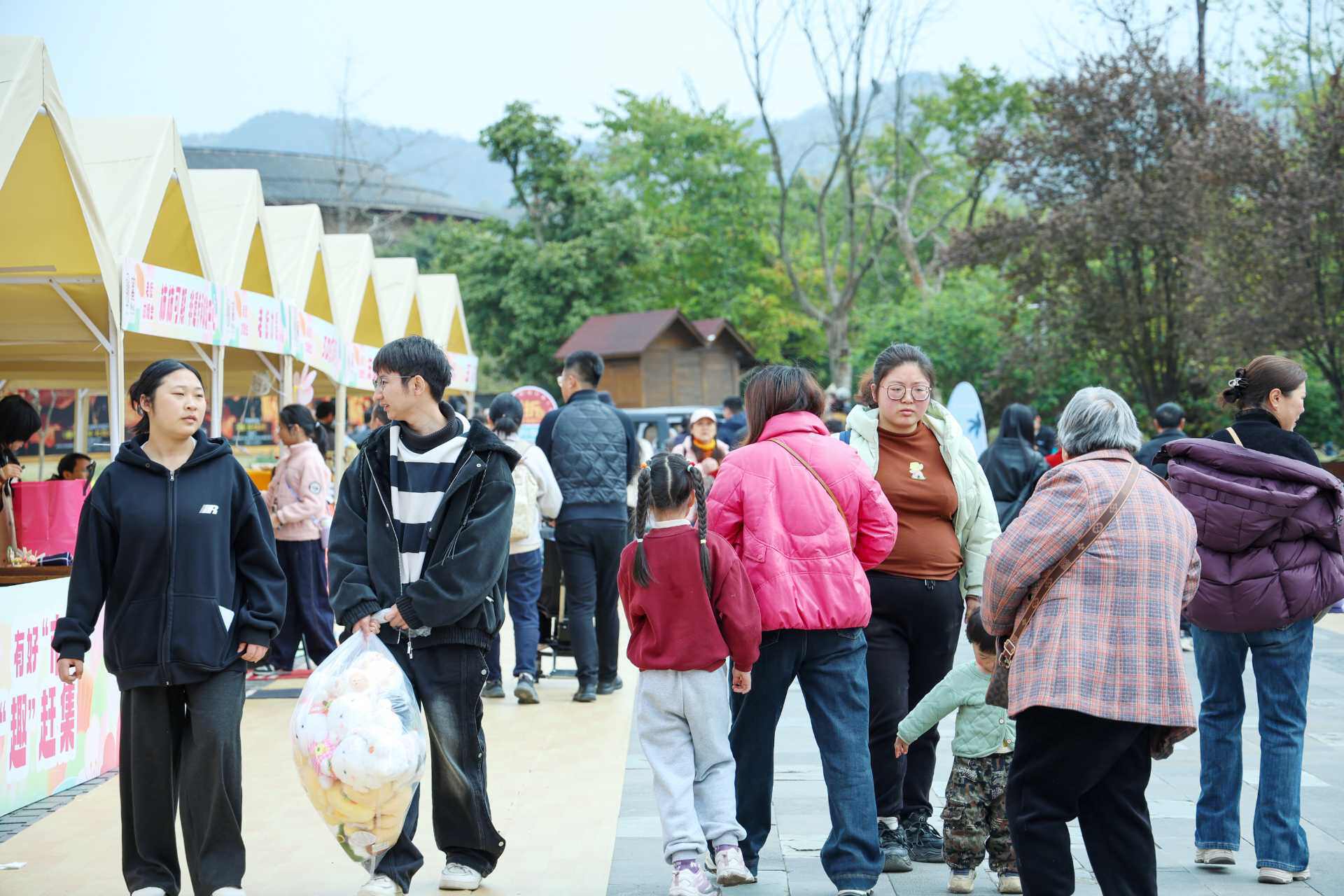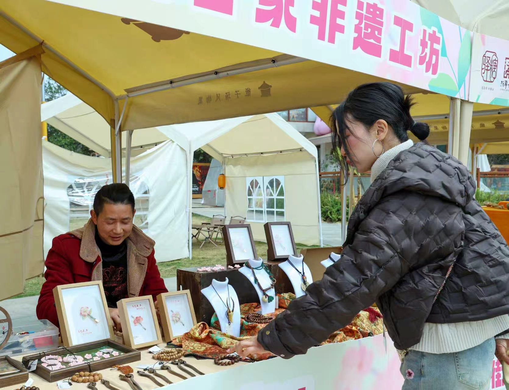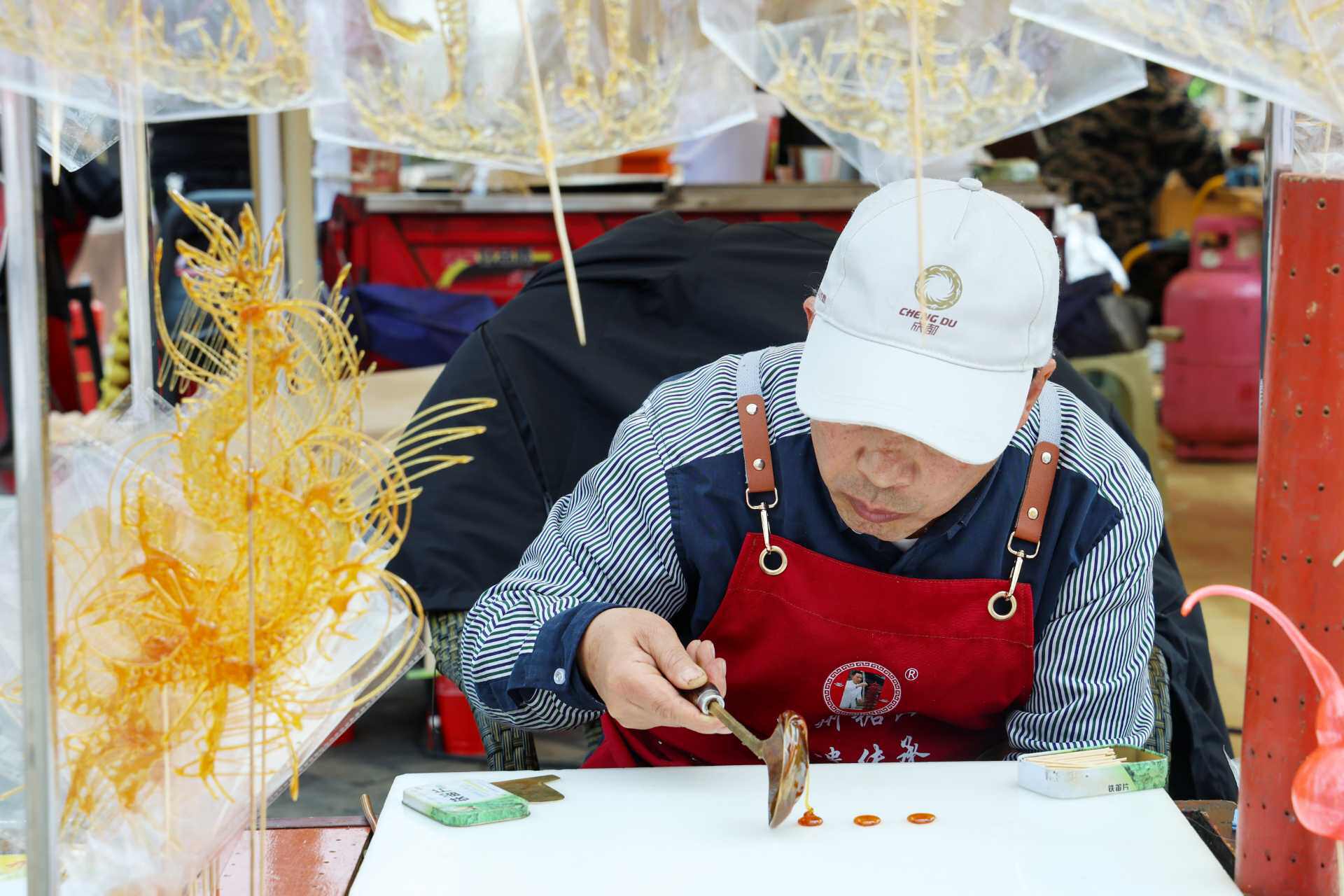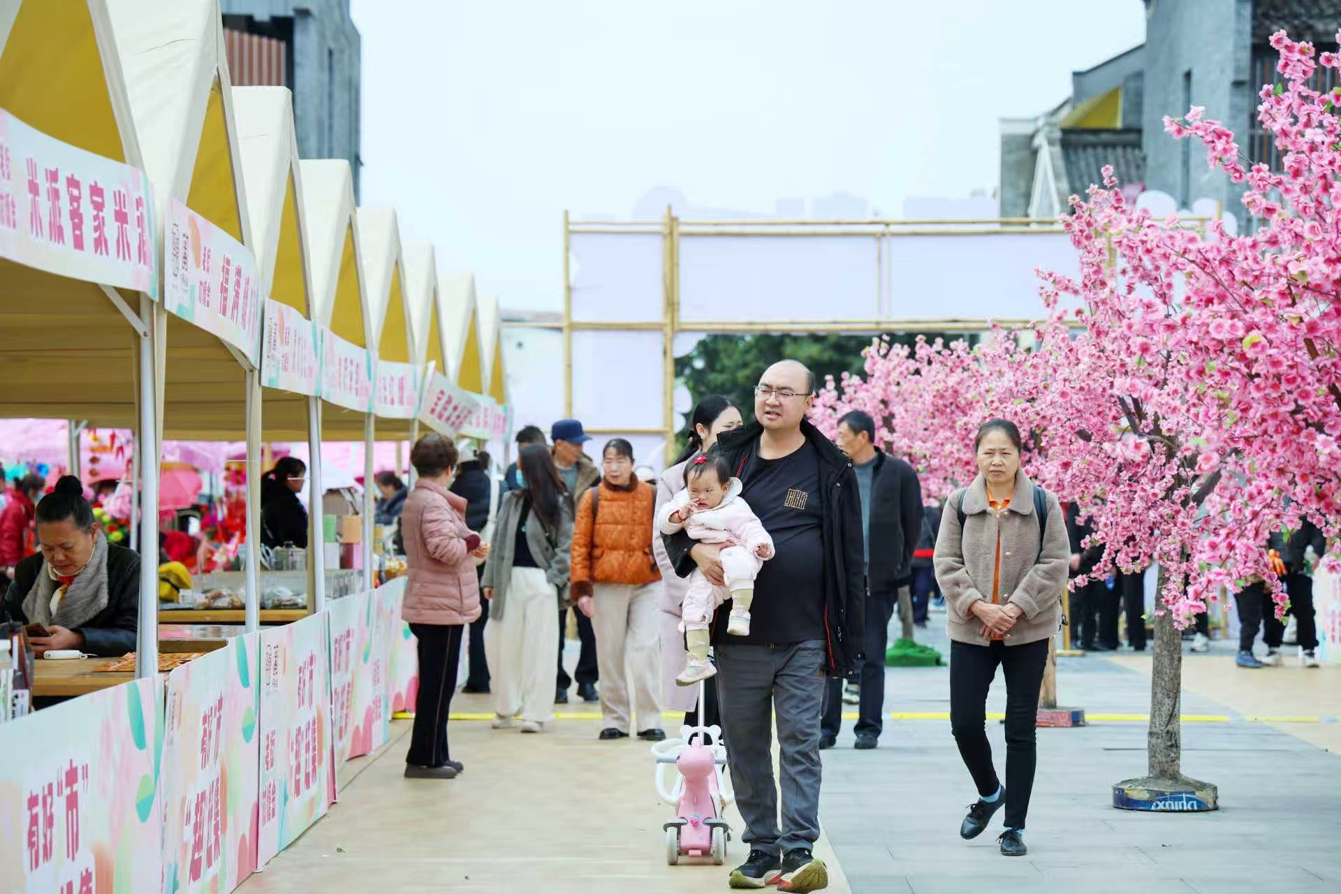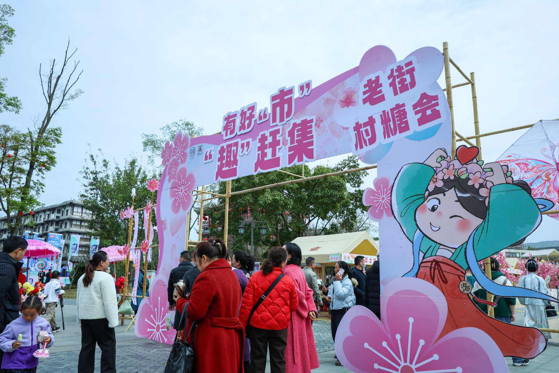 下午一点,记者来到洛带镇,桃花荟的专属集市——老街村糖会早已开市,青石板路上人来人往,吆喝声、谈笑声、音乐声交织在一起,勾勒出一幅鲜活的春日市井图。集市上,传统手工艺品琳琅满目,竹编的小筐、精巧的剪纸、色彩斑斓的蜀绣,每一件都透着老成都的韵味;特色美食香气四溢,伤心凉粉的酸辣、客家叶儿粑的软糯、手工糖画的甜香,让人垂涎欲滴,忍不住停下脚步,大快朵颐。