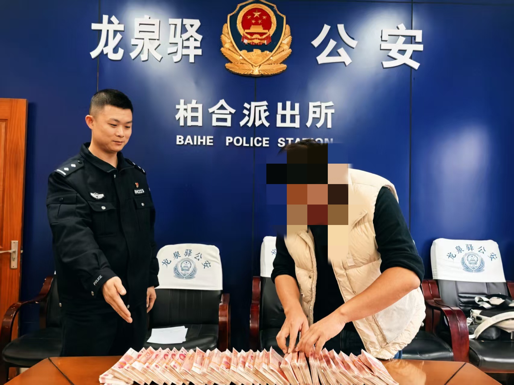 近日,成都市公安局龙泉驿区分局柏合派出所在开展侦查工作时,抓获“取钱手”周某,现场挡获现金30万元。经核查,这笔现金为受害人余先生的被诈骗款项。掌握到相关信息后,民警立即通知余先生到派出所。