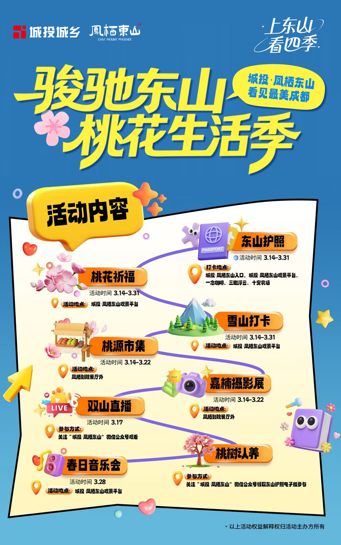 从嘉楠镜头下的艺术定格,到市民游客手中的幸运转盘;从一杯遥敬雪山的特饮,到一场唱给群山的心事音乐会……今年三月,城投·凤栖东山正以其独有的方式,邀请每一位成都人上山入怀,找到属于自己的桃花生活方式。