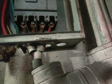 问题隐患4:车间多处配电箱未进行等电位跨接、孔洞未封堵、箱门损坏缺失。