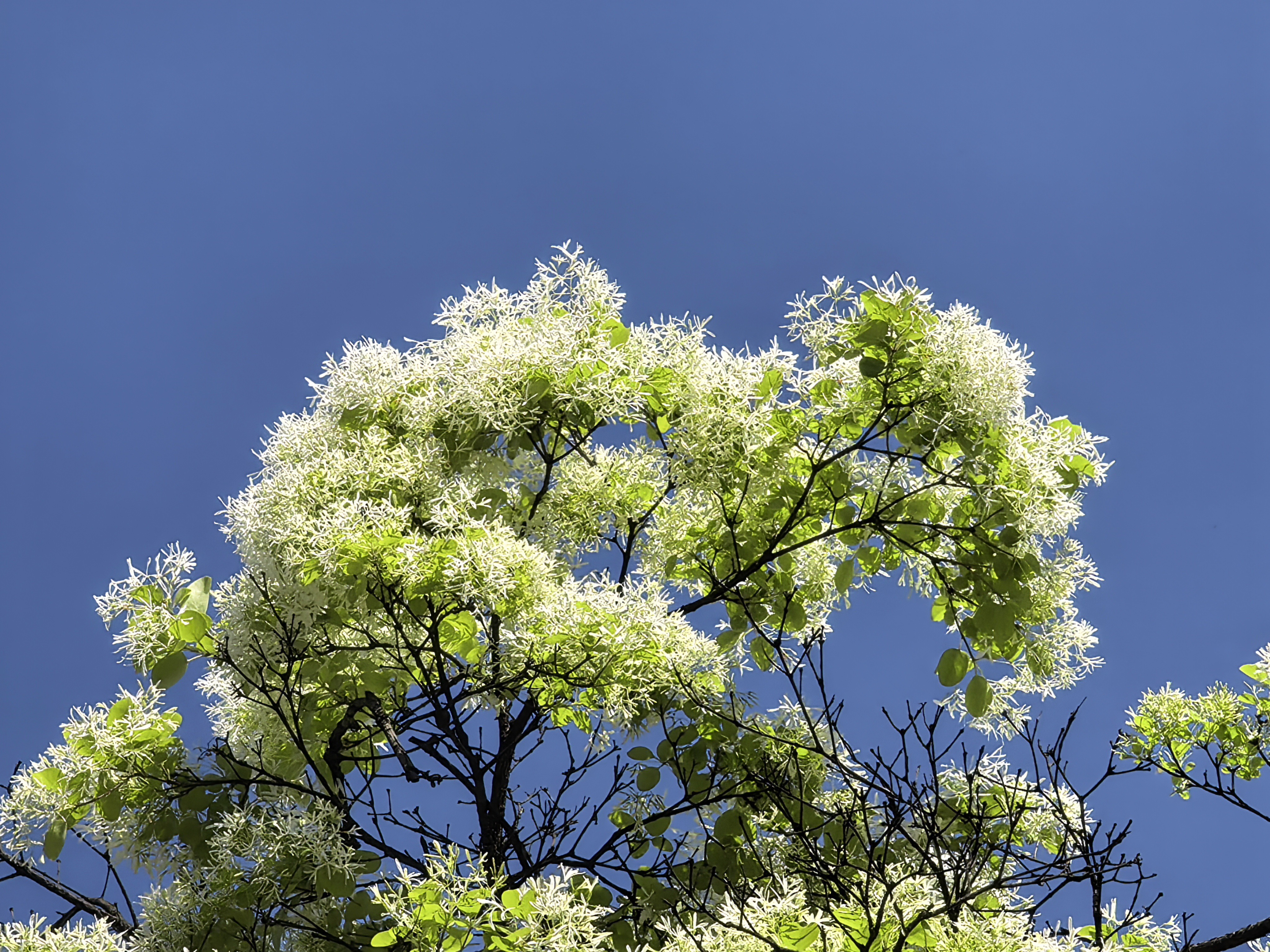 这株流苏树生在坡坎之畔,地势倾斜,根系深扎于黄土与青岩之间。正值初花期,满树细密的花瓣尚未全然素白,边缘处仍沁着浅浅的青绿,与枝头新生的嫩叶彼此映衬,深浅交错间,别有一番清雅的韵致。远山连绵如黛,层层叠叠的绿意铺展开去,唯此一树白花点缀其间,素而不孤,洁而不冷,反倒让那青翠愈发鲜亮,山色愈发空灵,仿佛天地间所有色彩都因这一抹白而愈发分明。